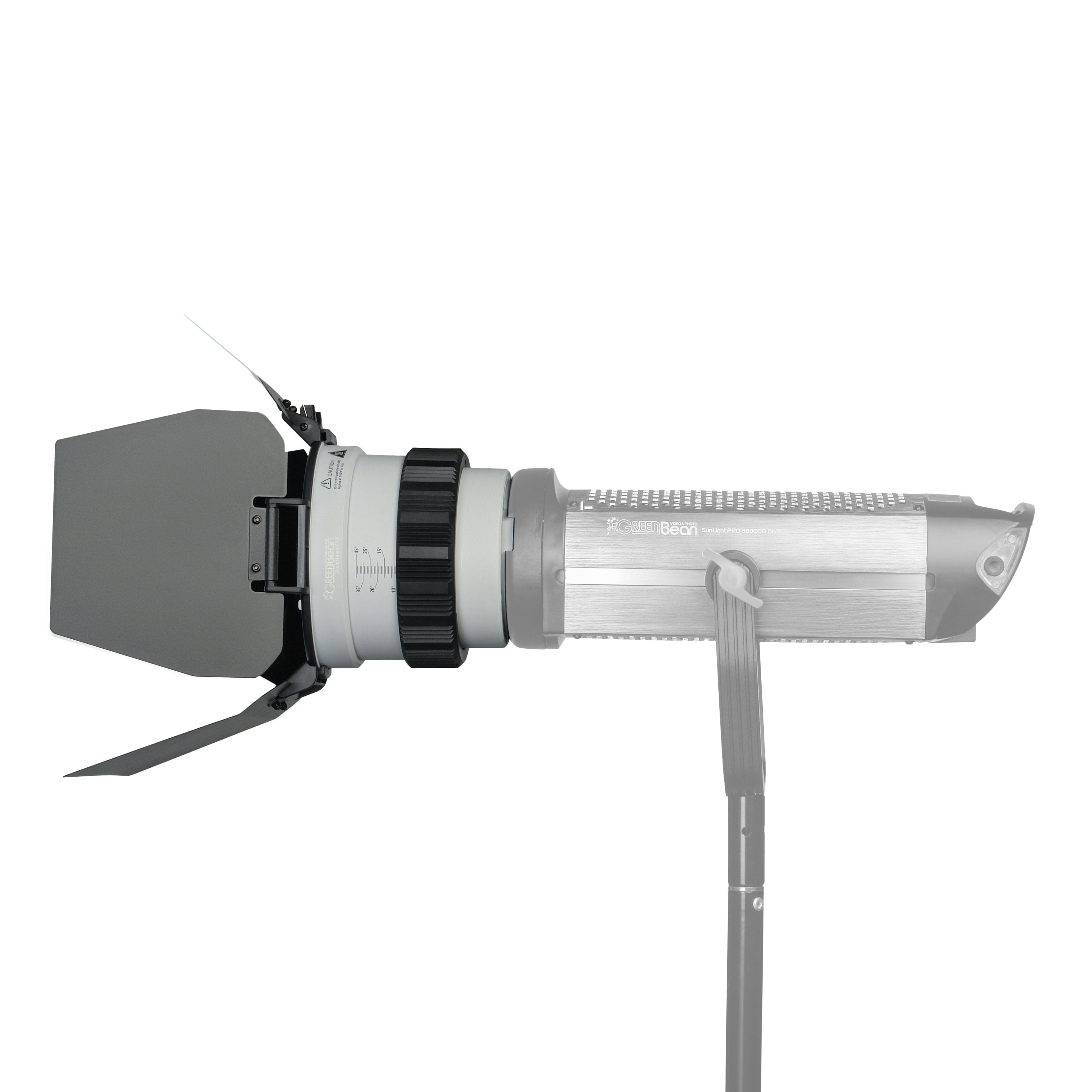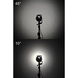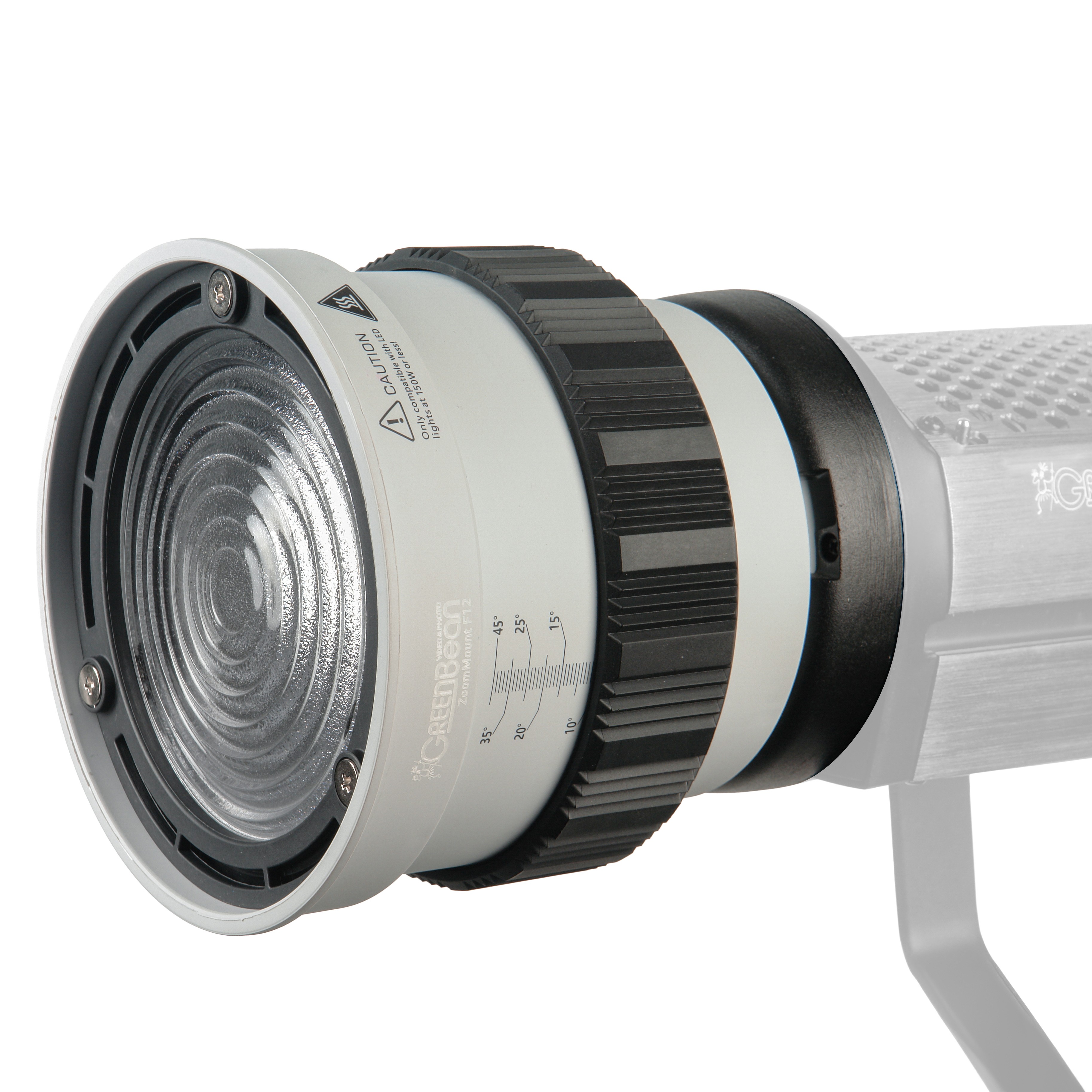 Оптическая насадка GreenBean ZoomMount F12 оснащена линзой Френеля диаметром 120 мм, позволяющей регулировать угол раскрытия светового луча от узкого пучка света (10°) до широкого потока (45°). Размер светового пятна изменяется плавным поворотом регулировочного кольца, снабженного удобной шкалой для точной установки нужного угла освещения.