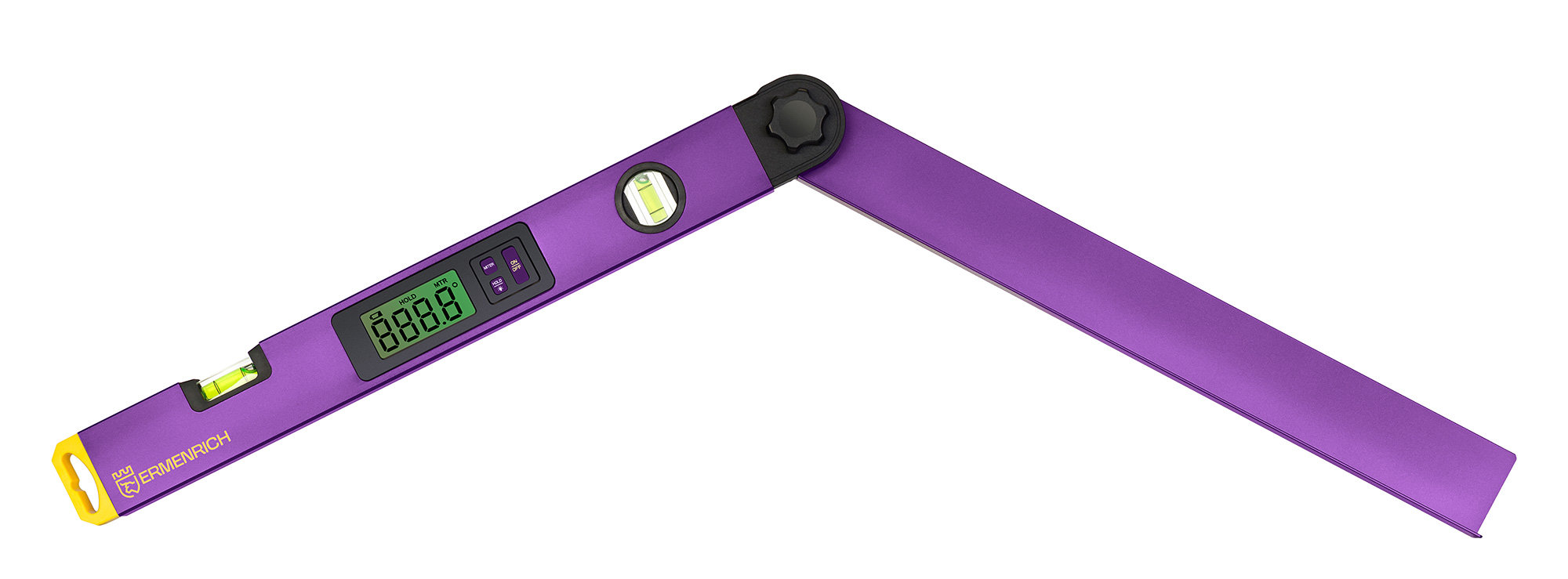 Ermenrich Verk DA40 – это цифровой угломер, который станет надежным помощником строителя, мастера по ремонту или монтажу оборудования. Прибор служит для точного измерения углов между поверхностями, а также может использоваться при распиловке длинных заготовок благодаря режиму расчета угла распила. Чтобы запустить этот режим, необходимо сохранить измеренное значение угла с помощью опции «Hold», а затем преобразовать его в величину угла среза, которая выставляется на торцовочной пиле. Управление функциями осуществляется с помощью удобных кнопок рядом с ЖК-экраном.