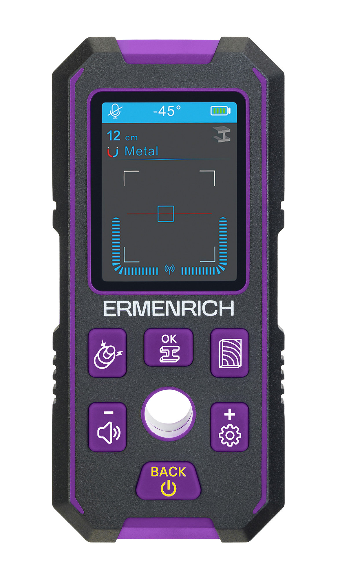 Детектор предназначен для выявления проводов под напряжением, труб, деревянных и металлических конструкций и крепежных элементов (гвоздей, болтов, саморезов), скрытых в полу, стенах или потолке. Прибор будет полезен во время ремонта для безопасного сверления стен или в начале строительства для демонтажа старых коммуникаций. Максимальная глубина обнаружения зависит от типа объекта: 38 мм для конструкций из дерева и металла, 50 мм для проводов под напряжением, 100 мм для черных и 120 мм для цветных металлов.