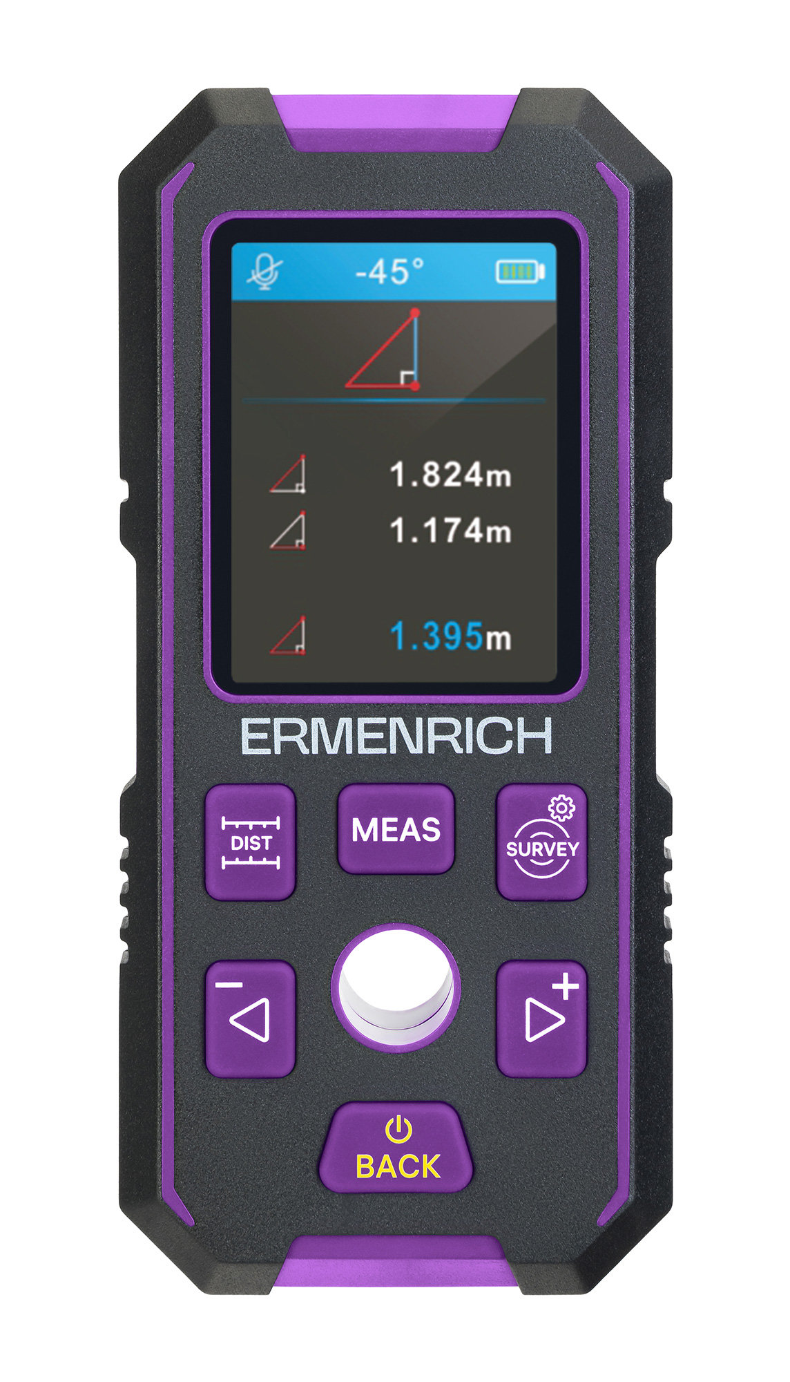 В детекторе Ermenrich Ping SM90 есть функция лазерной рулетки для измерения длины в диапазоне 0,2–40 м, доступно измерение в дюймах и футах. Предусмотрено два режима: единичное измерение или сканирование. Результаты замеров сохраняются во внутренней памяти детектора. По длине, ширине и высоте устройство автоматически вычисляет объем и площадь. С помощью функции «Пифагор» вычисляется длина стороны в прямоугольном треугольнике, например, для определения высоты объекта. Еще одна полезная функция – цифровой уровень для измерения углов от –90° до +90°.