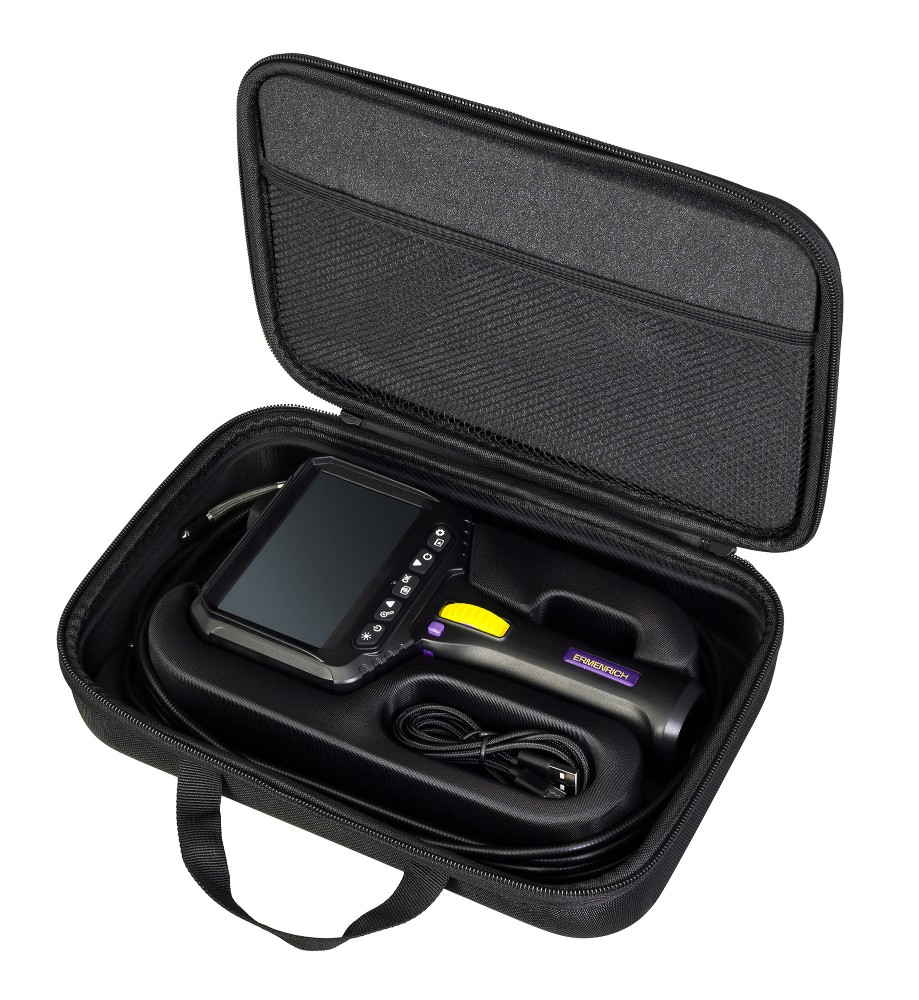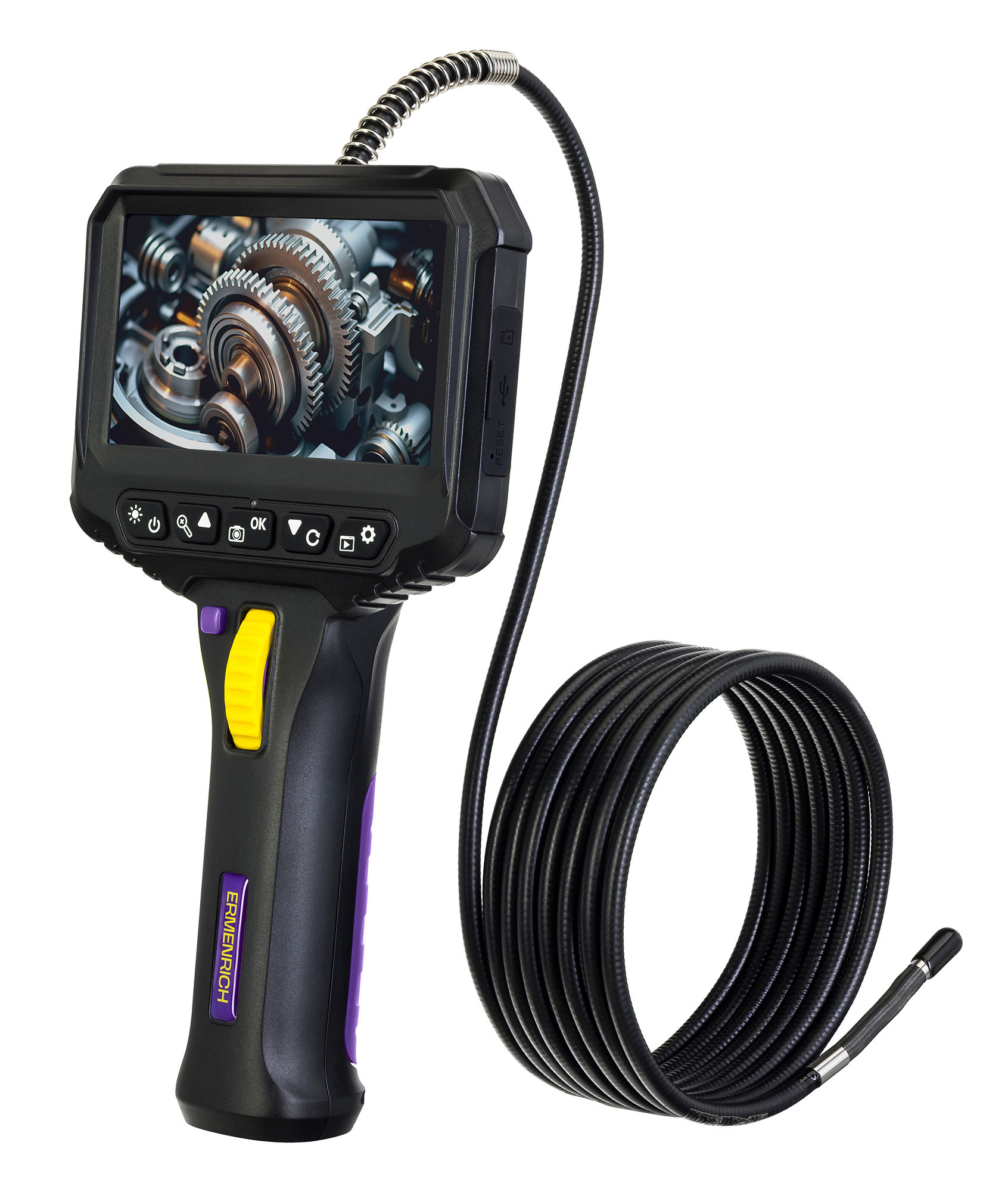 Видеоэндоскоп Ermenrich Seek VE80 был создан для облегчения контроля качества строительства и монтажа коммуникаций (труб, вентиляционных шахт, дымоходов, электропроводки и т. д.), особенно в труднодоступных и темных местах, застенных пространствах и полостях. Исследование интересующей области проводится при помощи специального зонда, состоящего из кабеля длиной 3 метра и 1 поворотной камеры, расположенной на его конце.