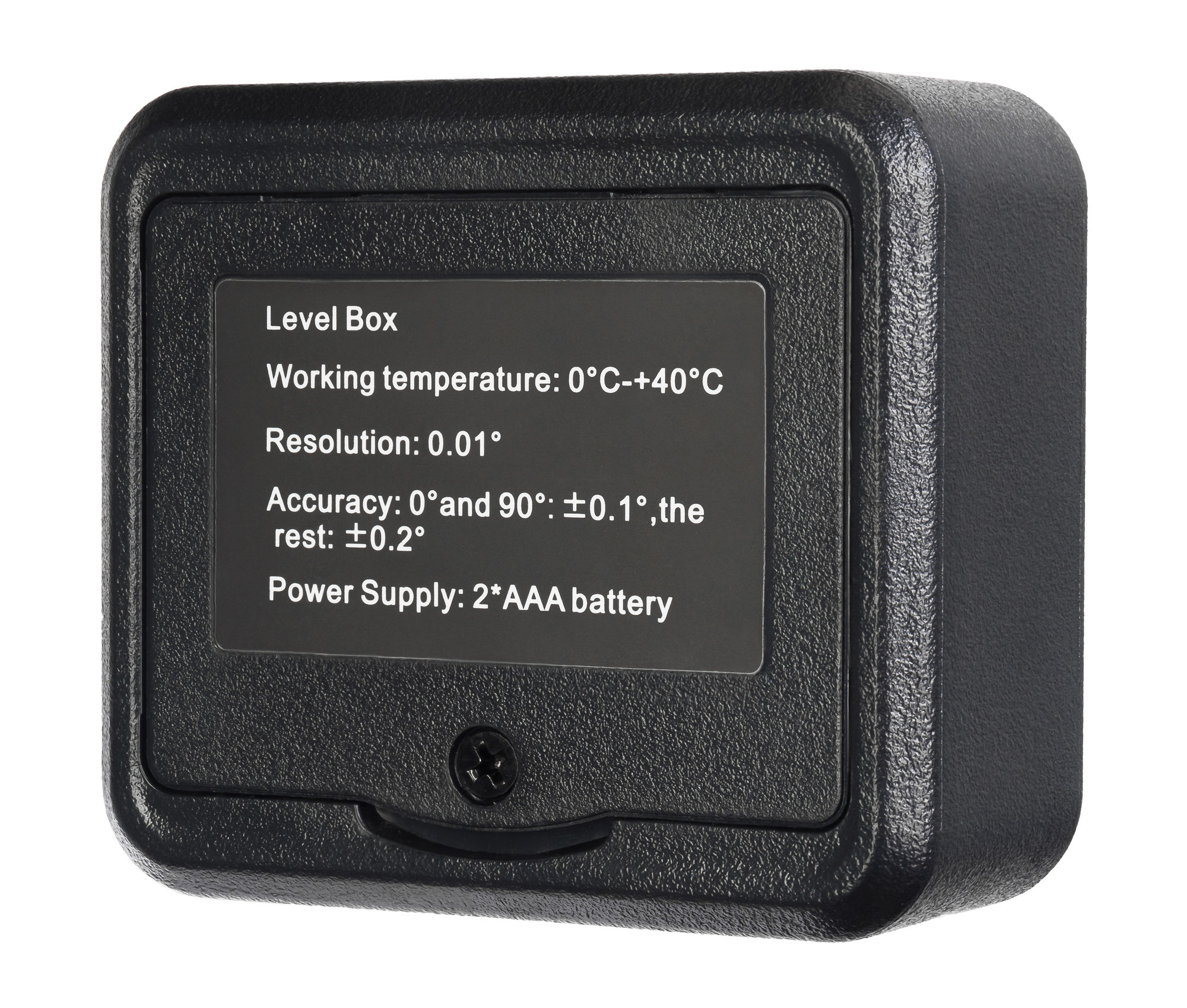 Уровень демонстрирует стабильную работу в диапазоне температур от 0 до +40 °С и защищен от вертикально падающих капель воды. Прочный корпус из поликарбоната и ABS-пластика выдерживает случайные удары и падения. Прибор работает от двух батареек типа LR03 AAA (нет в комплекте) и с помощью индикации заранее сообщает о необходимости их замены. В период бездействия прибор отключается автоматически для экономии заряда.