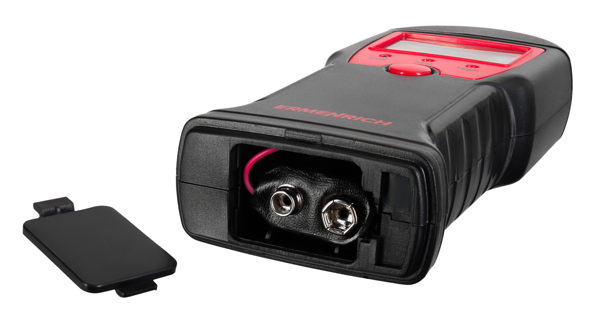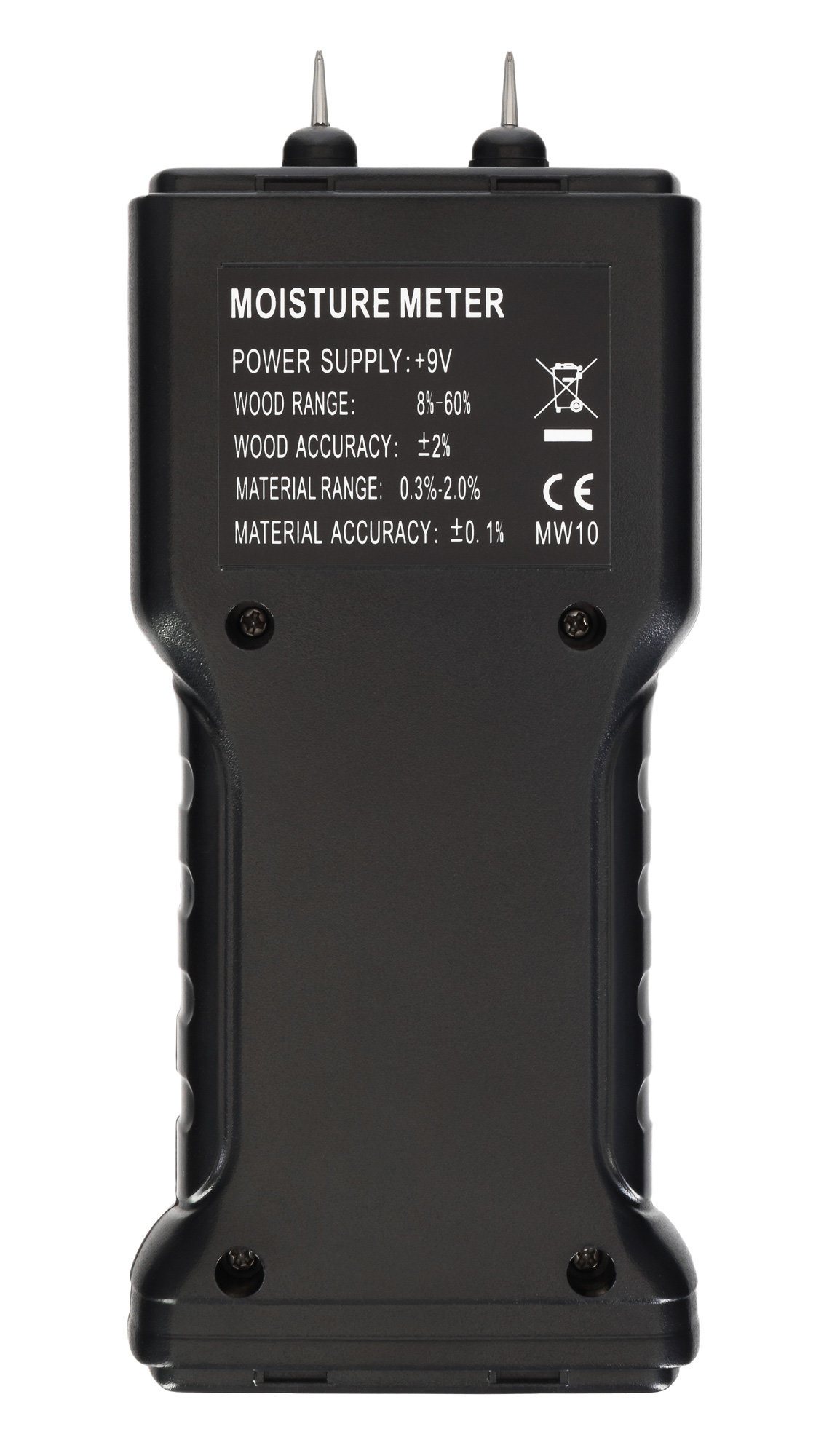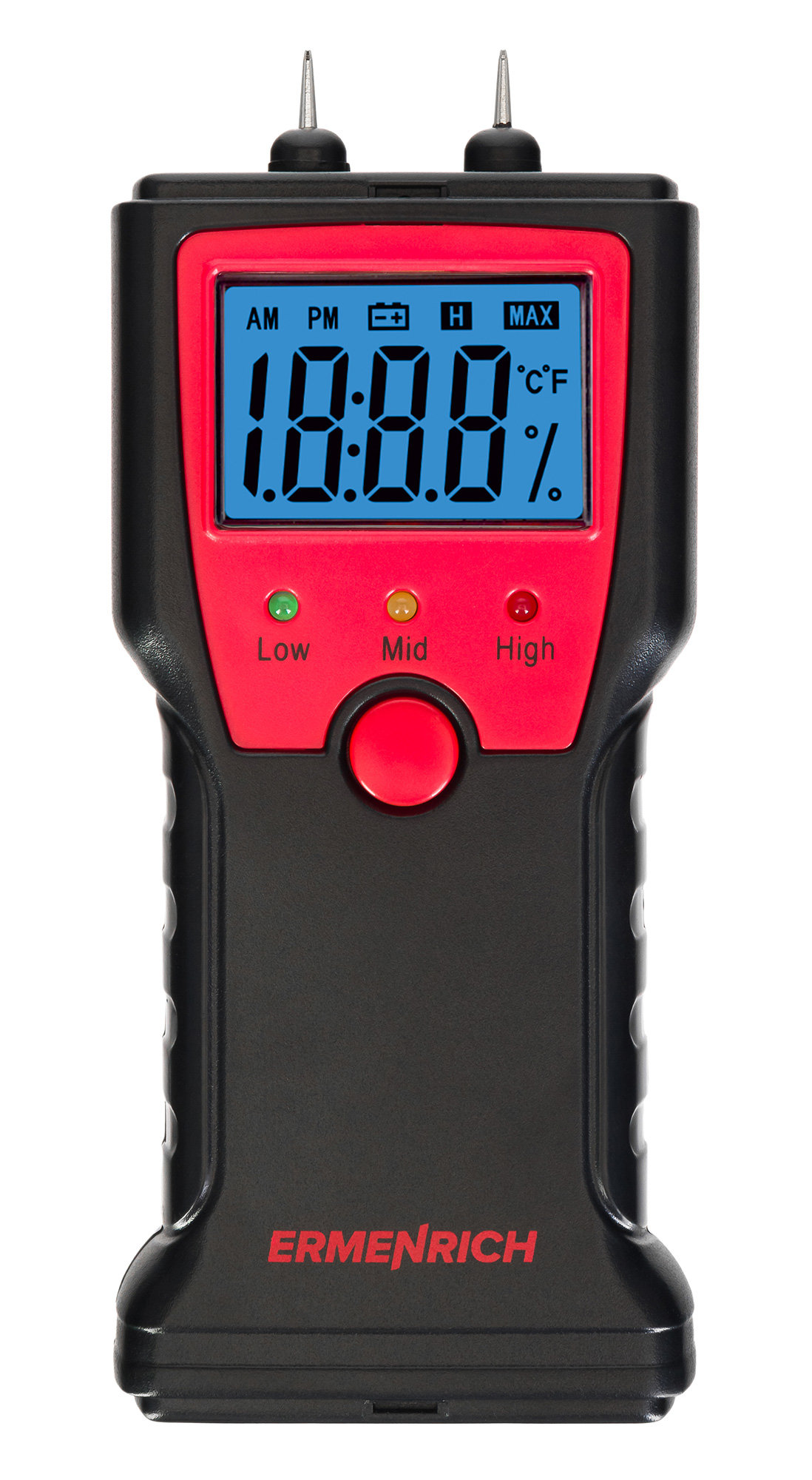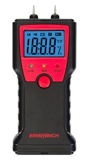 Датчик влажности (влагомер) Ermenrich Wett MW10 – портативный измерительный инструмент, который определяет уровень влажности разных материалов: в первую очередь сделанных из древесины, но также и предназначенных для строительных работ (растворов, смесей и проч.). Он работает по контактной технологии, т. е. имеет пару игольчатых сенсоров, которые и проводят замеры. Также прибор может определять температуру.