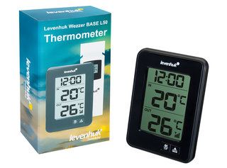 Levenhuk Wezzer BASE L50 – прибор, который сочетает в себе функции термометра и часов. Измерения температуры проводятся в двух местах одновременно – благодаря наличию в комплекте беспроводного внешнего датчика. Это позволяет узнавать температуру и дома, и за окном, получая наиболее точные климатические данные без обращения к внешним метеослужбам. Также в памяти прибора сохраняются минимальные и максимальные показания. С таким гаджетом вы всегда будете в курсе приближающегося похолодания.