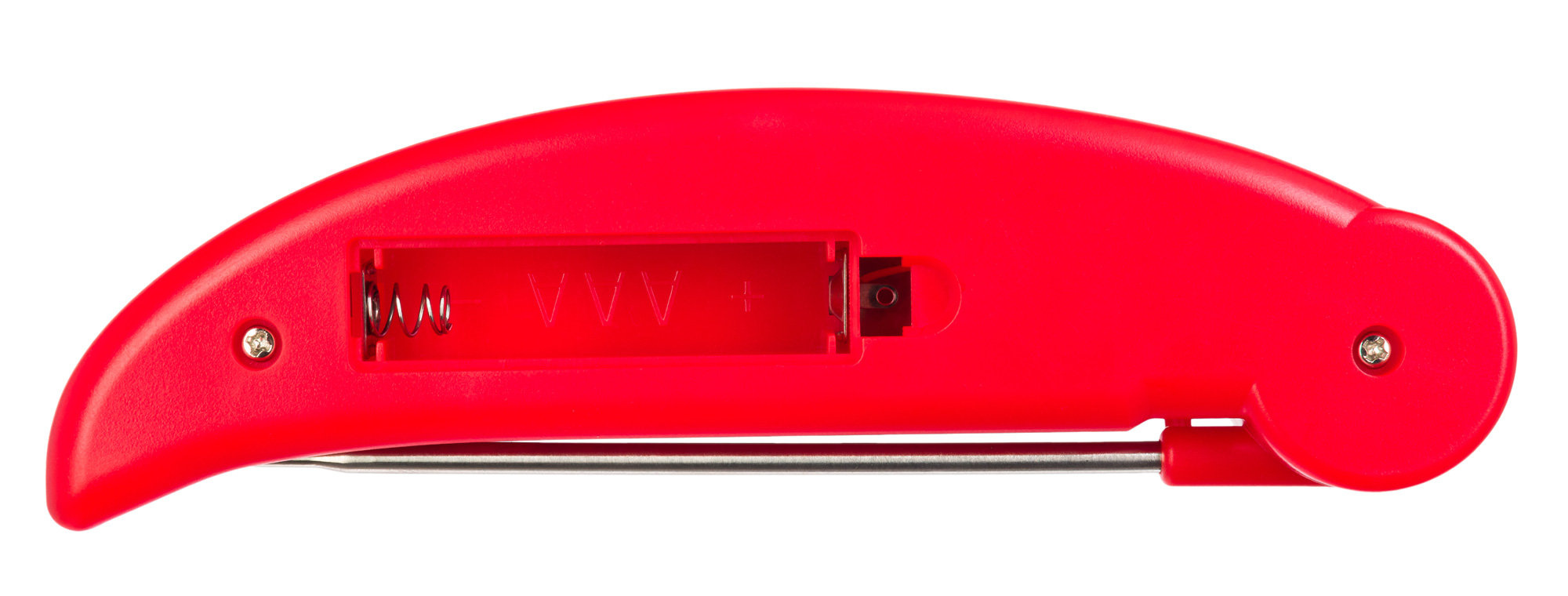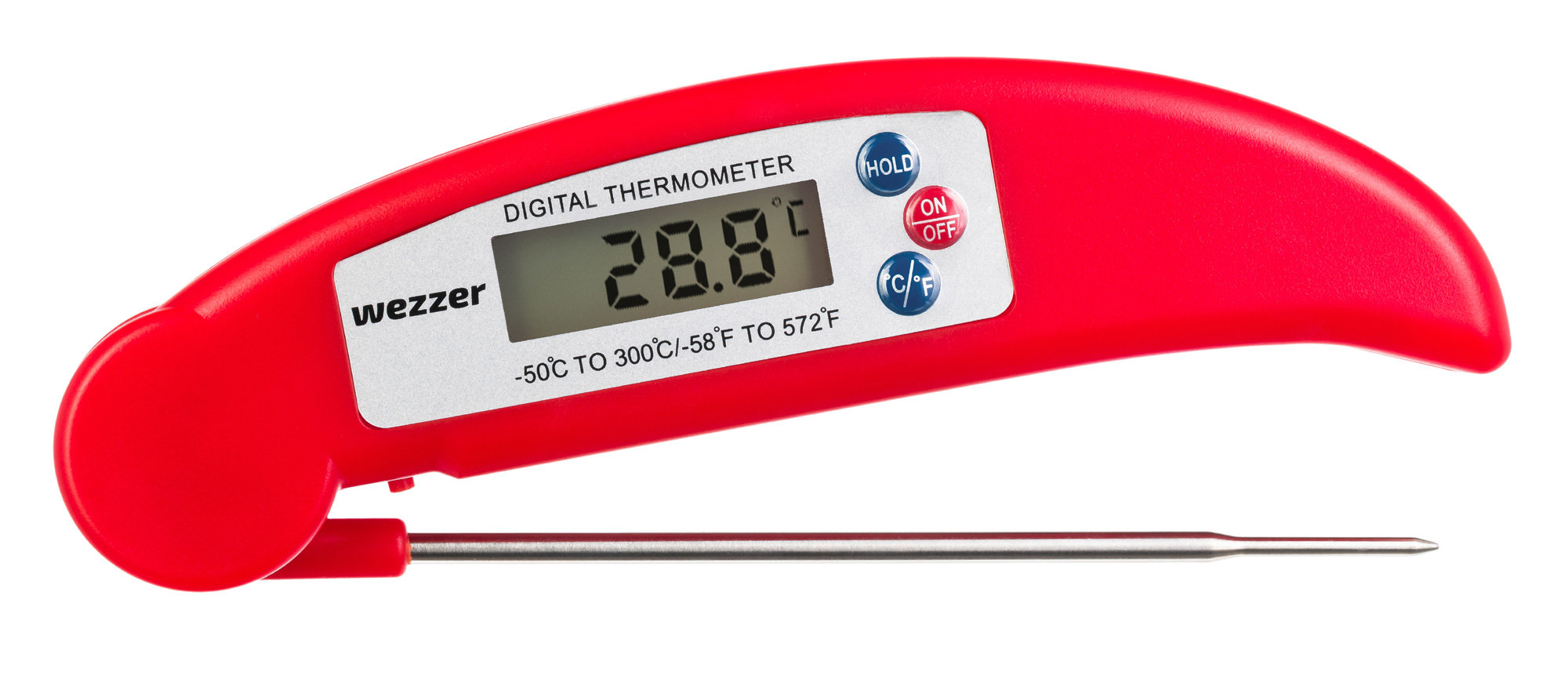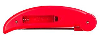 Корпус прибора сделан из ABS-пластика, который имеет высокую ударопрочность. Показания отображаются на встроенном монохромном экране, для управления используются всего три кнопки, одна из которых нужна для фиксации текущей температуры. Откидной игольчатый щуп сделан из нержавеющей стали 304 – этот материал широко применяют в пищевой промышленности. Питание прибора – стандартная батарейка, для экономии заряда здесь предусмотрена функция автоотключения.