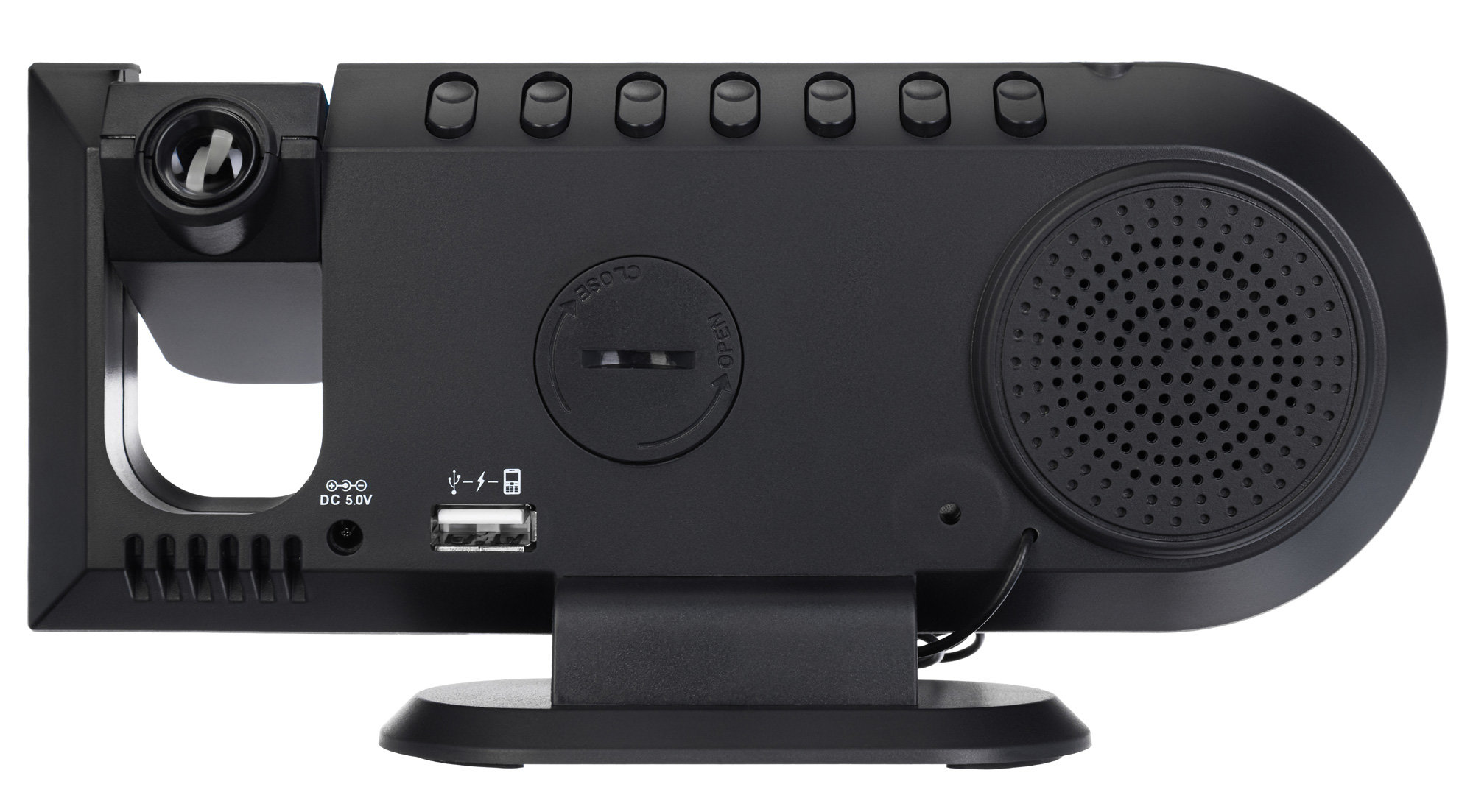 Дизайн прибора очень сдержанный и современный, что подчеркивается продуманной проработкой мелких деталей. Первое, на что обращаешь внимание при взгляде на прибор, ‒ это ЖК-экран с зеркальной поверхностью. Он абсолютно черный, поэтому насыщенные белые символы хорошо выделяются на его фоне. На передней панели нет кнопок управления – они вынесены на заднюю крышку. Проектор можно наклонять под наиболее удобным углом, причем линия соприкосновения с основным блоком практически невидима.