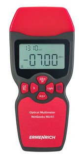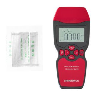Мультиметр Ermenrich NetGeeks NU40 подходит для тестирования одномодовых и многомодовых кабелей. Для подключения к линии используется интерфейс FC, поддерживаются дополнительные интерфейсы SC и ST. Измерения выполняются в дБм или Вт, единица измерения выбирается отдельной кнопкой. С помощью отдельной кнопки можно установить опорный уровень для быстрого определения потерь. Результат с указанием единиц измерения отображается на монохромном дисплее с подсветкой. Прибор питается от 3 батареек типа AAA (не входят в комплект поставки).