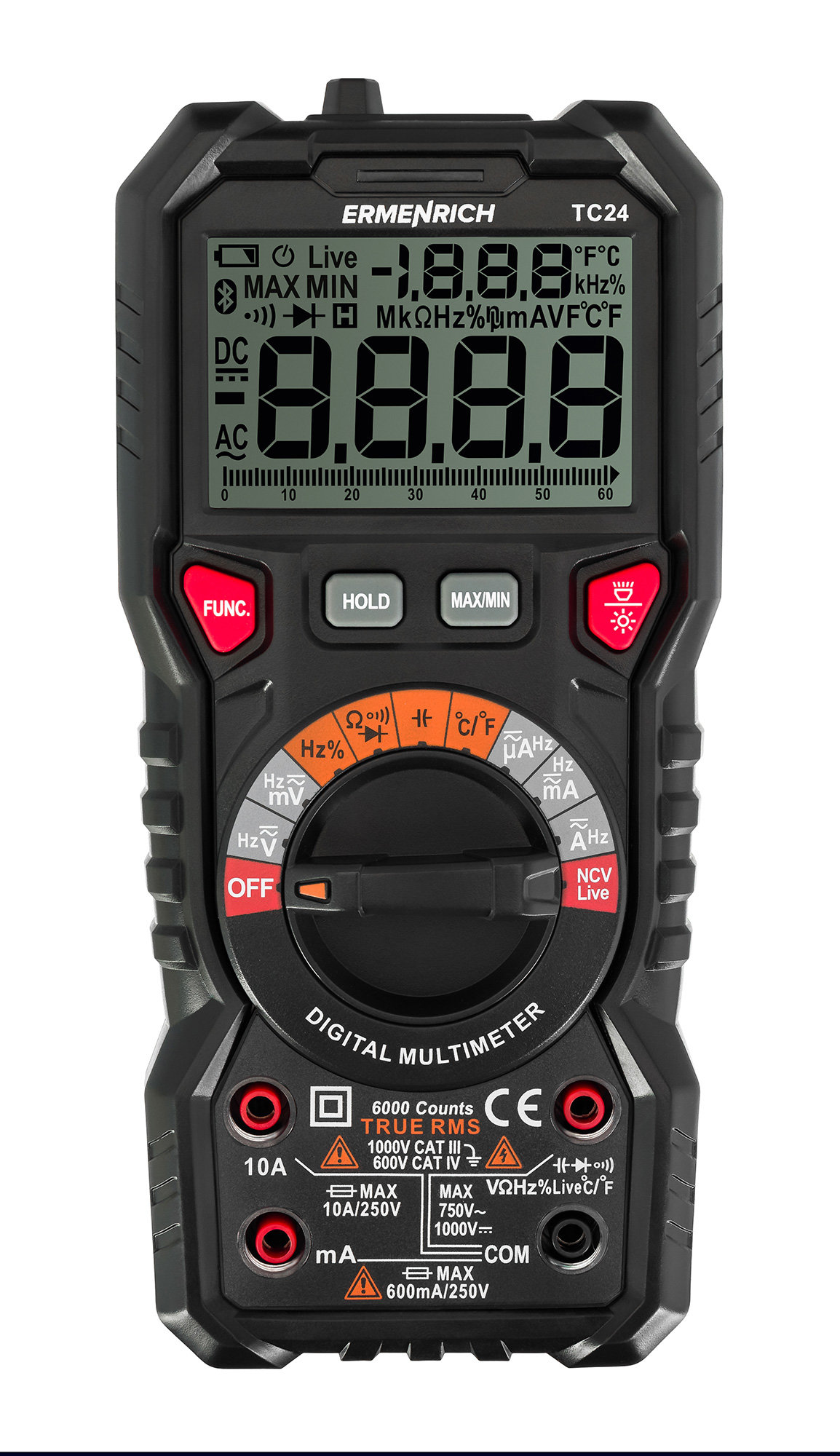 Цифровой мультиметр Ermenrich Zing TC24 – устройство для измерения характеристик электрического тока (силы и напряжения) и проводника (сопротивления и емкости). С его помощью также можно измерять рабочий цикл и температуру, определять фазу, находить обрывы на линии (прозвонка кабеля), обрывы и пробои диодов. Доступна функция NCV для бесконтактного обнаружения проводки в полу или в стенах и детектирования опасного напряжения. Измерения осуществляются по истинному среднеквадратичному значению (True RMS), предел измерения выбирается автоматически.