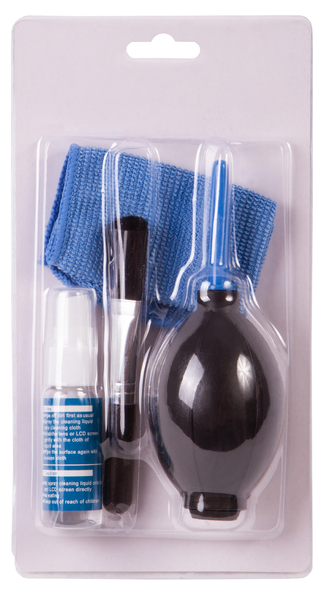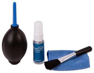 Воздушная груша предназначена для бесконтактной очистки: она эффективно сдувает мелкую пыль и ворсинки. Мягкая кисточка позволяет убирать более крупные пылевые частички и мусор. Жидкое средство наносится на салфетку из микрофибры и используется для очистки от серьезных загрязнений, в том числе жирных пятен. Его рекомендуется применять на последнем этапе очистки, когда вся мелкая пыль уже убрана.