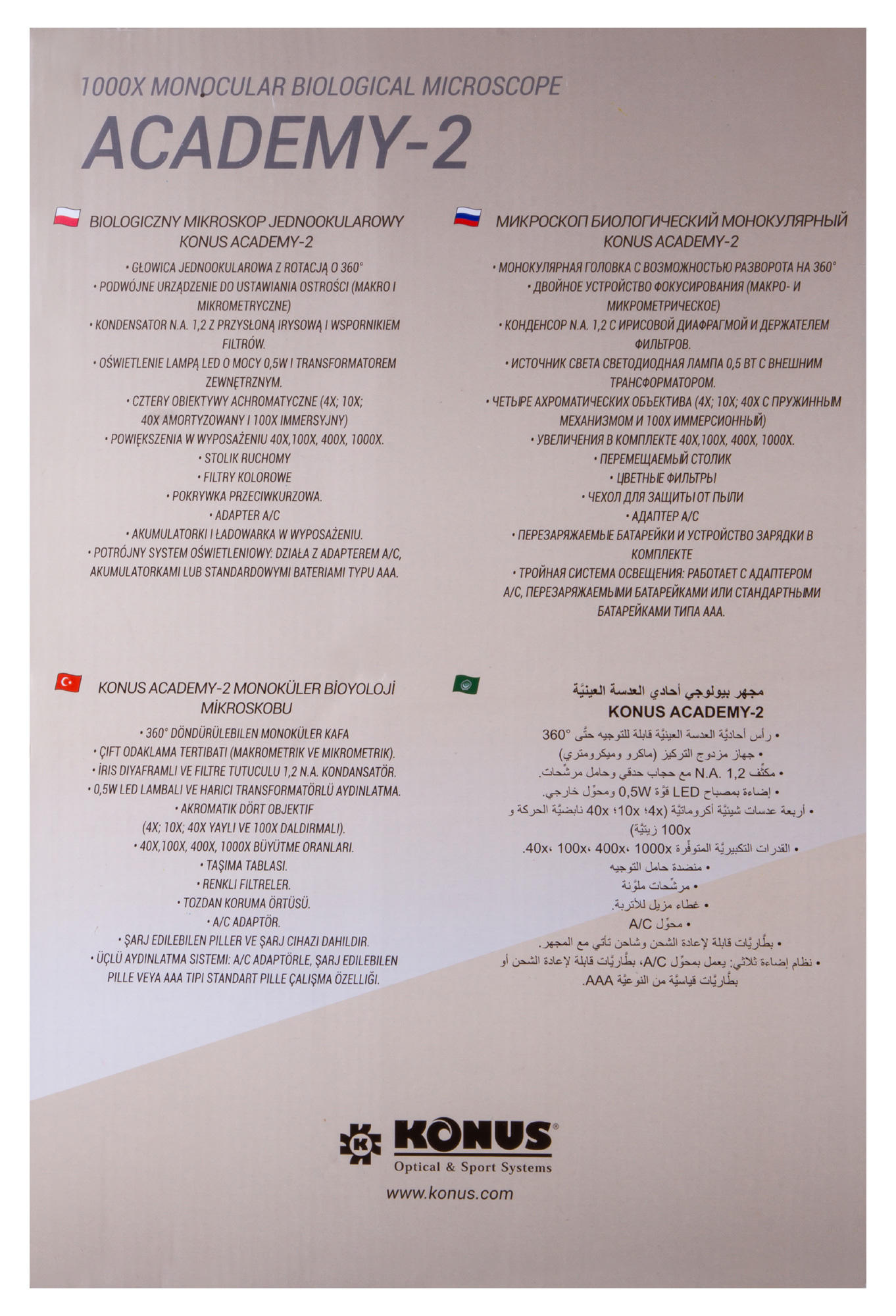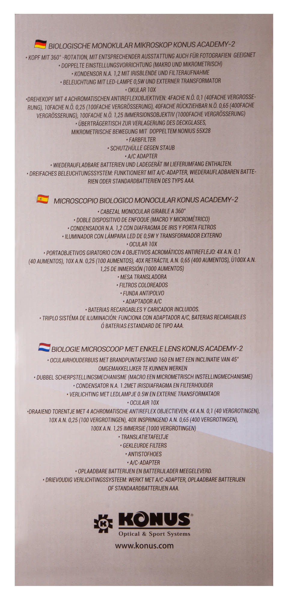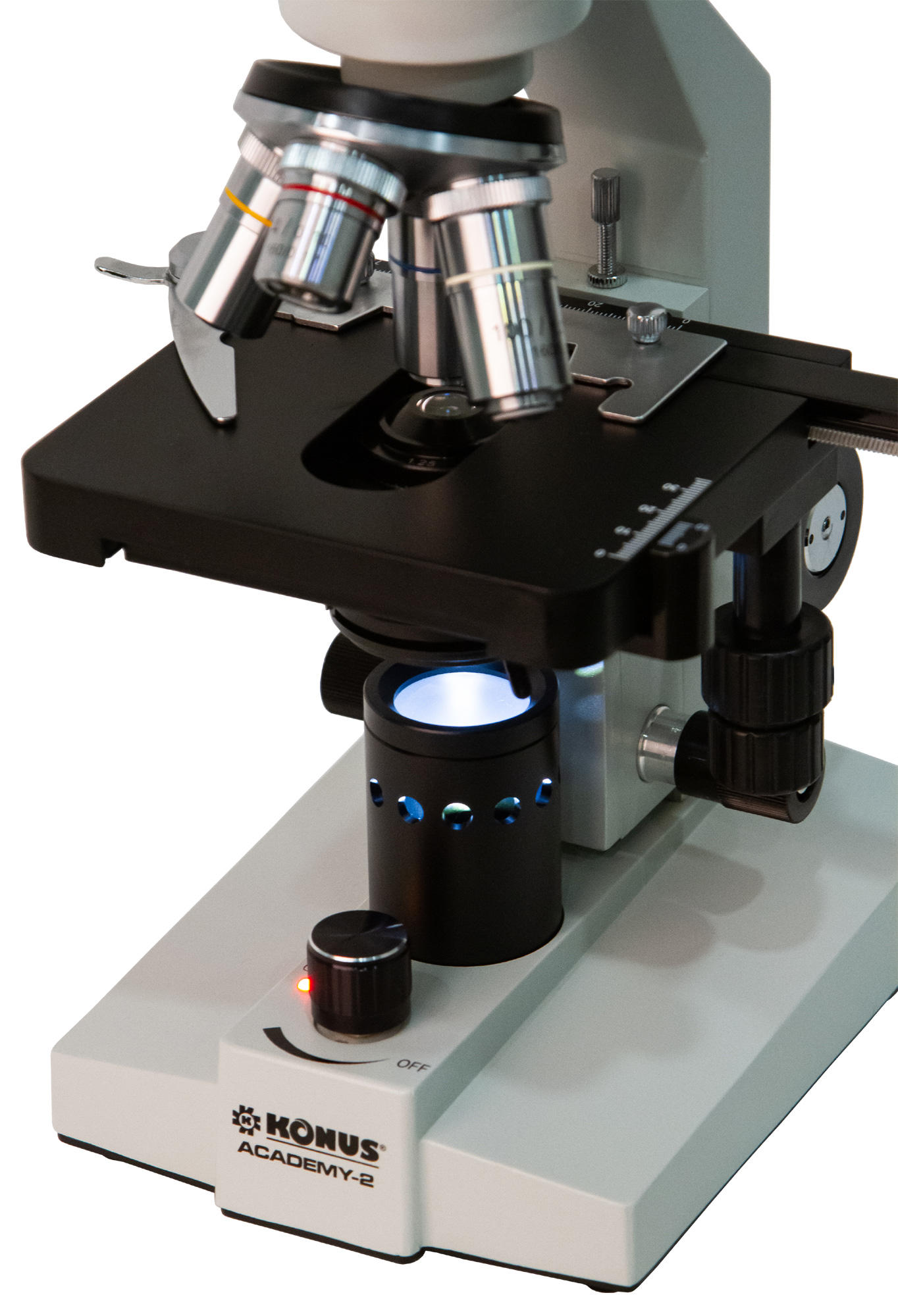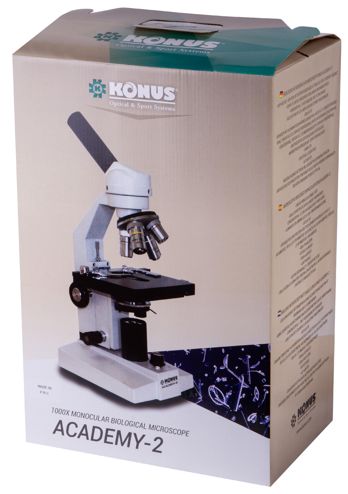 Konus Academy-2 1000x – классический биологический микроскоп для исследования образцов в светлом поле. Он позволяет использовать не только «сухой» метод, но и масляную иммерсию. Микроскоп станет отличным помощником в изучении основ микробиологии и поможет совершенствоваться в любимом научном хобби. Это прекрасный выбор для школьника или студента, а также нетребовательного любителя.