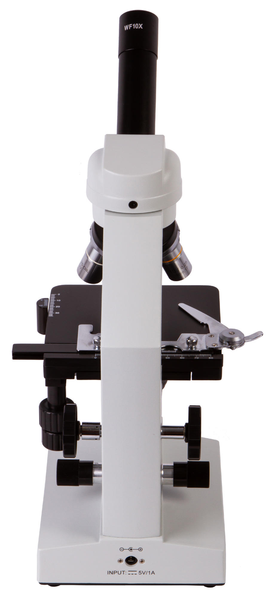 Подсветка расположена внизу. Она представляет собой небольшой светодиод, который может работать не только от сети, но и от батареек. Яркость подсветки можно регулировать. Также под предметным столиком находится двухлинзовый конденсор Аббе с ирисовой диафрагмой, что позволяет более точно настраивать освещение рабочей области. Есть держатель для светофильтров.