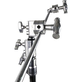 Удлинительный кронштейн KUPO KCP-240 EXTENSION GRIP ARM SILVER с увеличенной рукояткой представляет собой стальную трубку длиной 40 дюймов и диаметром 5/8" (16 мм), на конце которой установлена крепежная головка 2,5". Шероховатая насечка на штанге предотвращает скольжение. Крепежная головка состоит из пары вращающихся алюминиевых дисков с гнездом 5/8" (16 мм). Диски имеют четыре V-образных отверстия разного диаметра — 5/8", 1/2", 3/8" и 1/4", что позволяет надёжно зажимать штифты и трубки соответствующего размера. Насечки на внутренней поверхности отверстий обеспечивают уверенное сцепление с аксессуарами. Крепежная головка оснащена увеличенной эргономичной Т-образной рукояткой и подшипниками, обеспечивающими высокий крутящий момент. Фрикционный диск из алюминия с антисоскальзывающей текстурой обеспечивает надёжную фиксацию и долговечность. Основой механизма служит сплошной стальной центральный болт с зафиксированным штифтом для надёжной посадки в алюминиевом корпусе. Кронштейн 40" в сочетании с крепежной головкой 2,5" позволяет гибко позиционировать гобо, рассеиватели, флаги и другие аксессуары в любом положении.