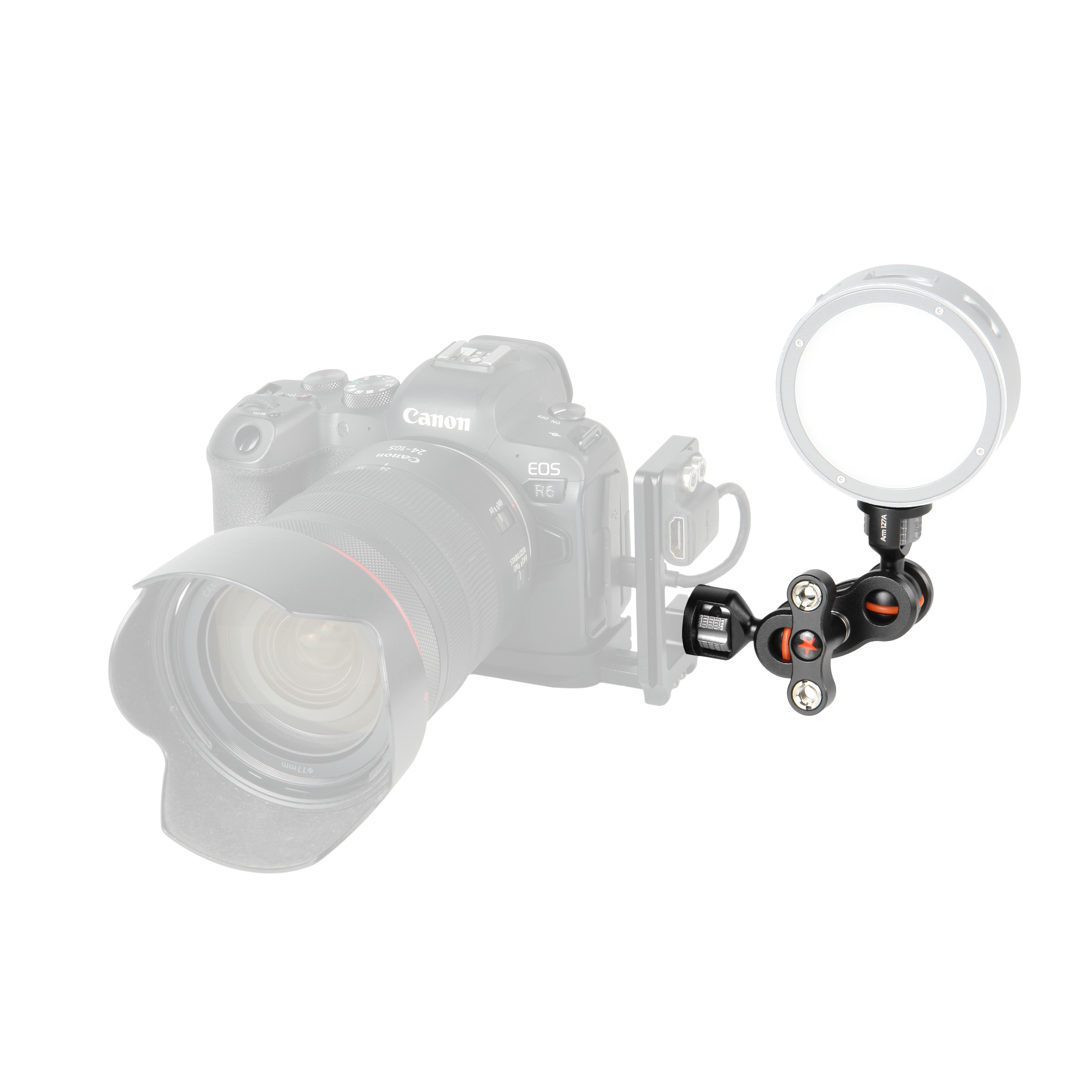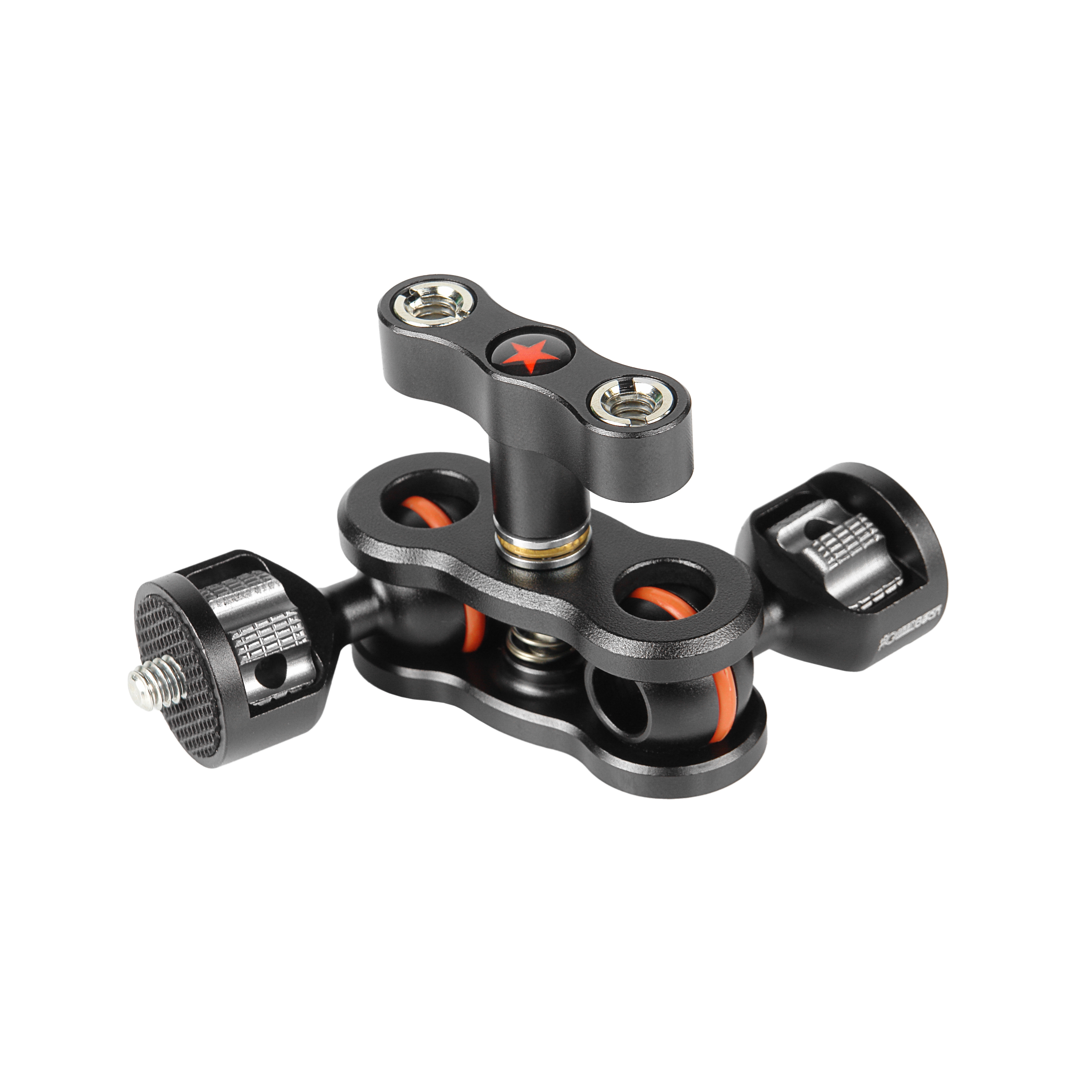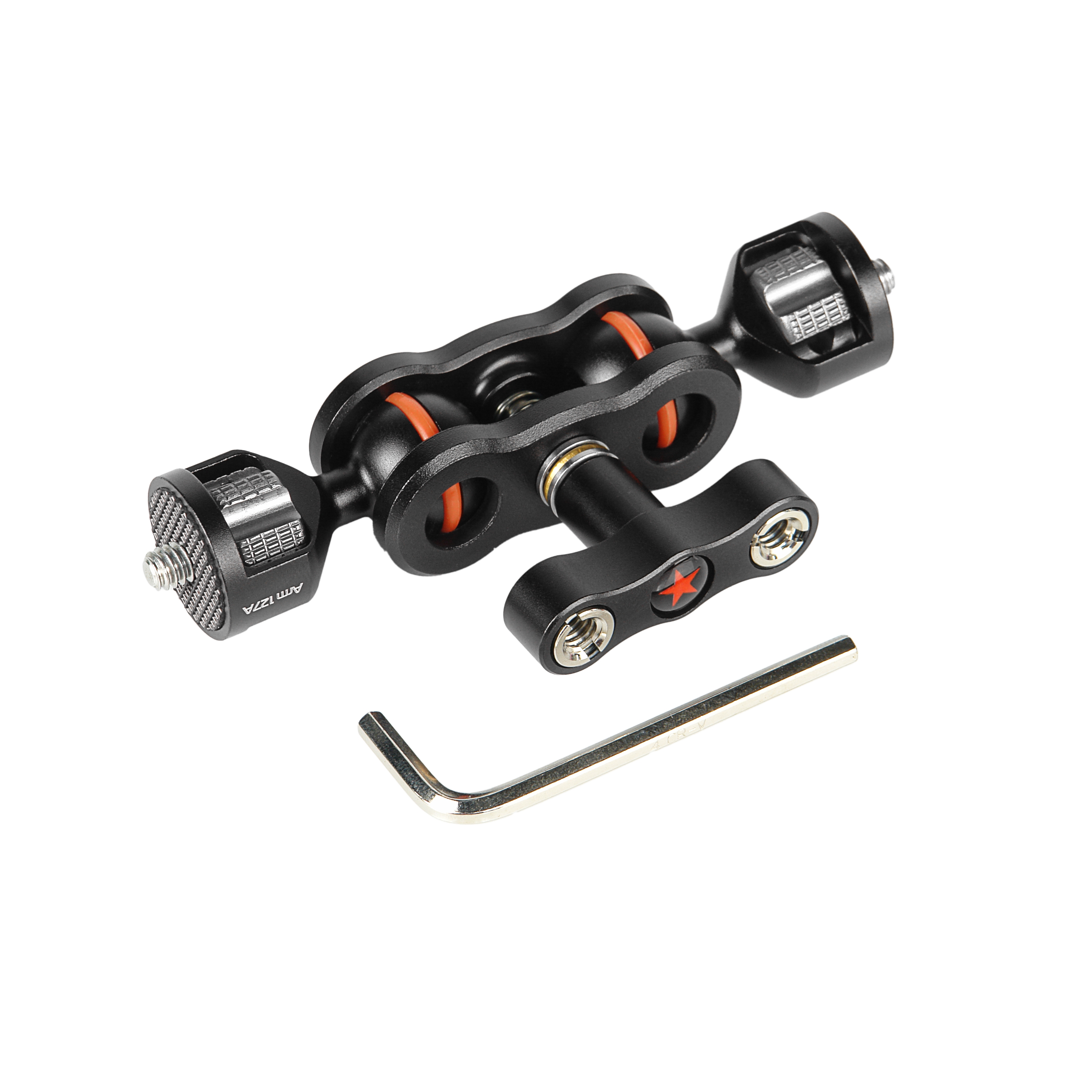 Держатель Arm 127A оснащен двумя шаровыми шарнирными головками, каждая из которых обеспечивает полное вращение на 360 градусов вокруг своей оси и наклон до ±135 градусов. Оба шарнира одновременно блокируются одним надежным зажимом, в конструкции которого используется опорный шарикоподшипник для плавного и точного хода.