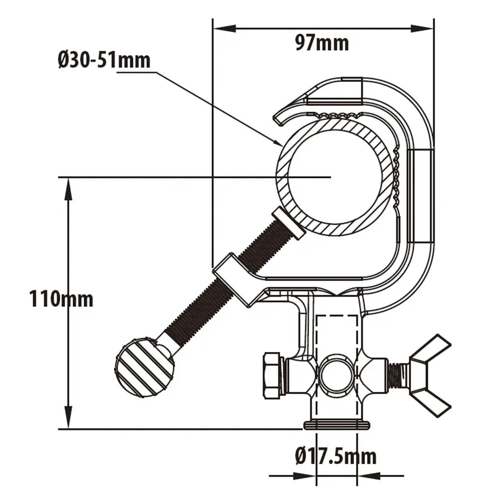 Зажим KUPO C-01B STEEL CLAMP с крюком C-типа изготовлен из высокопрочного чугуна и отличается исключительной прочностью и надёжностью. При собственном весе всего 0,64 кг он выдерживает нагрузку до 40 кг. Подходит для труб диаметром от 30 до 51 мм. Оснащён гнездом 17 мм и креплением с внутренней резьбой 3/8"-16, что облегчает установку осветительных приборов. Барашковая рукоятка обеспечивает удобную фиксацию и настройку угла наклона прибора, а вращающаяся площадка на винте защищает трубу от повреждений. Особенно хорошо подходит для использования в студиях, театрах, фотостудиях и в других профессиональных сферах.