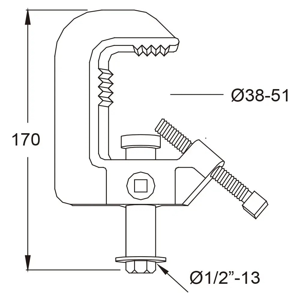 Зажим KUPO C-06 HEAVY DUTY CLAMP классический C-типа (pipe clamp) предназначен для подвеса осветительных приборов и другого оборудования на стальные трубы диаметром от 1-1/2" до 2", применяемые в театральных перекладинах. Оснащён стальным стержнем длиной 2,5" с болтом 1/2"-13 и шайбой. Установочный винт с квадратной головкой позволяет поворачивать прибор. Покрытие — чёрное порошковое.