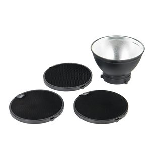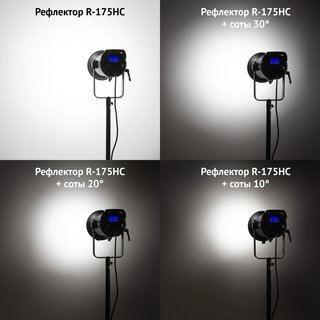 В комплект с рефлектором входят три сотовые насадки с углом рассеяния светового потока 10°, 20°, 30°. Чем меньше угол рассеяния, тем меньше образуемое световое пятно и больше яркость светового потока. Благодаря этому рефлектор способен обеспечить как ограниченное точечное (например, подсветка волос или акцент на предмете), так и широкое фоновое освещение.