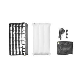 В сдутом виде FA100 компактно складывается и занимает совсем немного места. Вместе с аксессуарами и насосом он весит всего 1,65 кг. К софтбоксу прилагается сумка для хранения и перевозки размером 48х32 см, в которую помещается весь комплект.