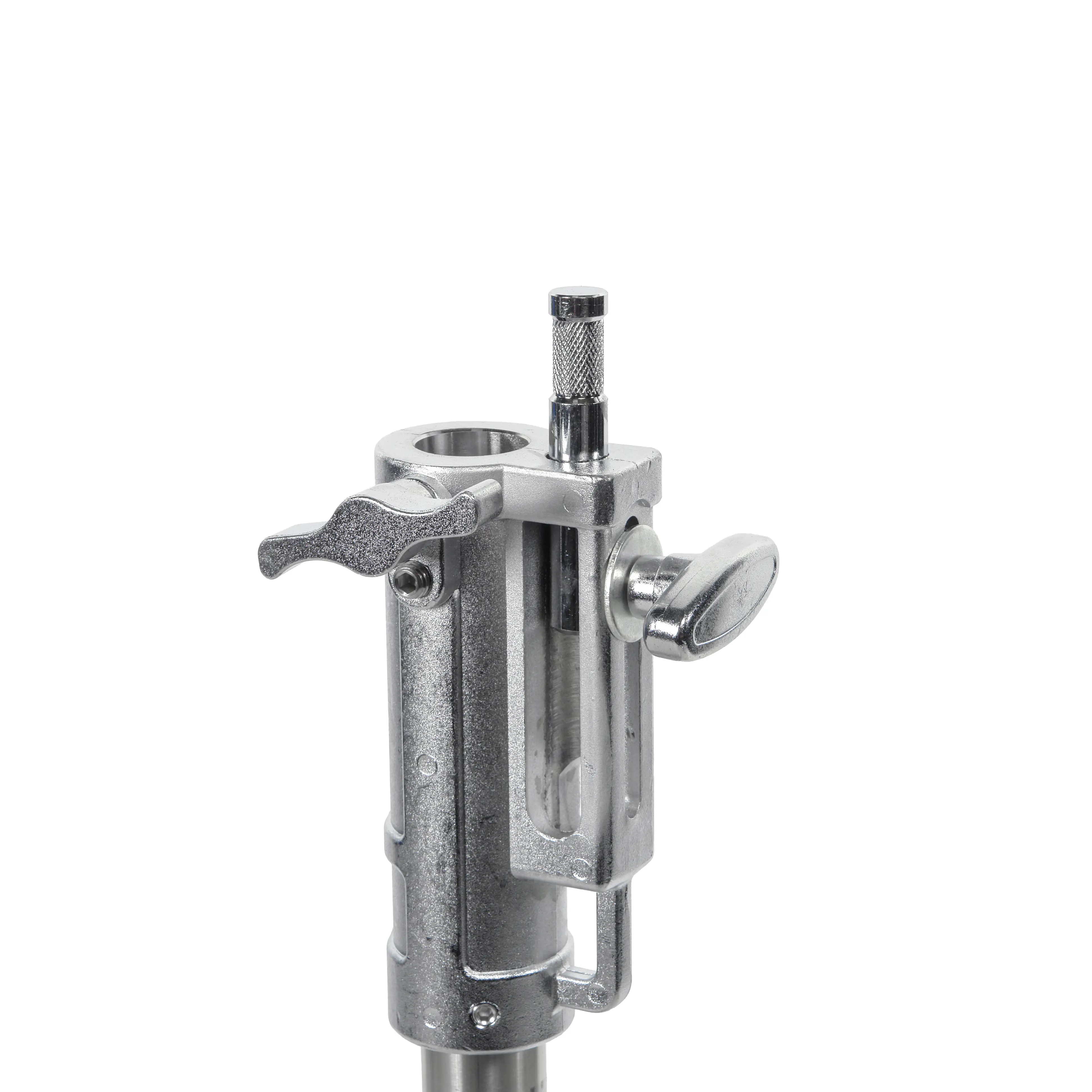 Стойка изготовлена из цельной стали, что гарантирует жесткость и устойчивость при полной нагрузке. Телескопическая четырехсекционная колонна на треноге достигает максимальной высоты 450 см. Большой диаметр секций (40/35/30/25 мм) обеспечивает оптимальную жесткость и распределение нагрузки, минимизируя раскачивание. Каждая секция надежно фиксируется усиленными винтовыми зажимами.