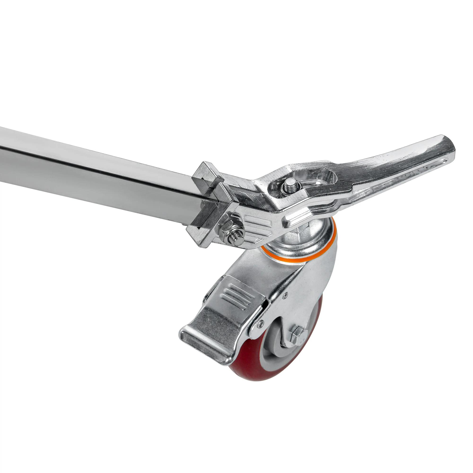 Стойку можно использовать как стационарную или мобильную за счет съемных колес. Резиновые колеса Ø100 мм с тормозами имеют свободный угол вращения и плавный ход. Тормозной механизм убережет стойку от случайного перемещения.