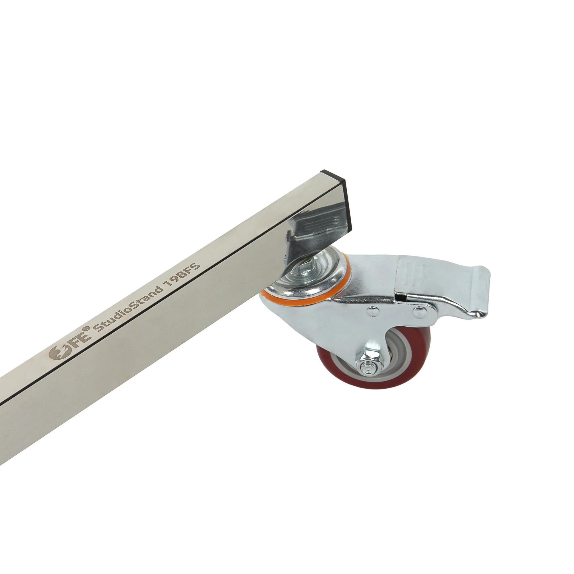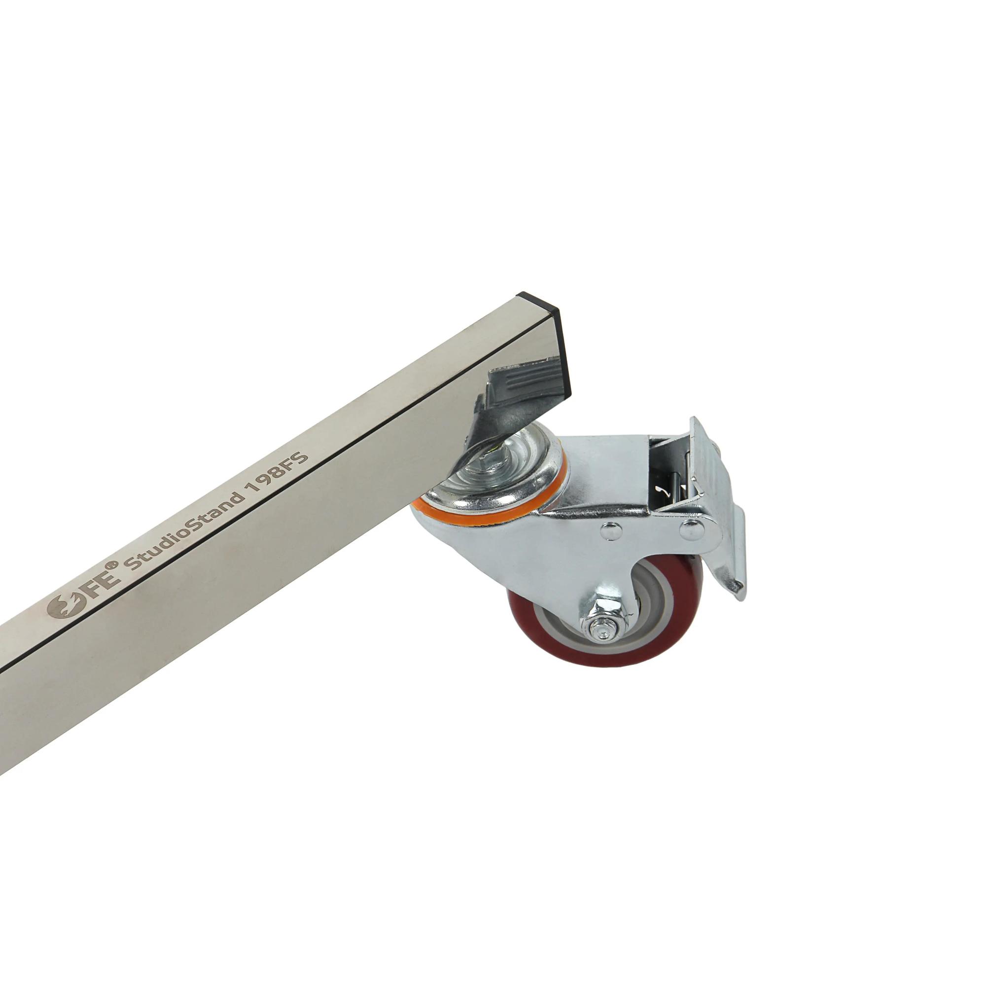 StudioStand 198FS имеет низкую устойчивую опору с тремя колесами Ø75 мм, каждое из которых оснащено тормозным механизмом для простого перемещения на любой съемочной площадке: в павильоне, студии или на улице. Стойку также можно использовать без колес.