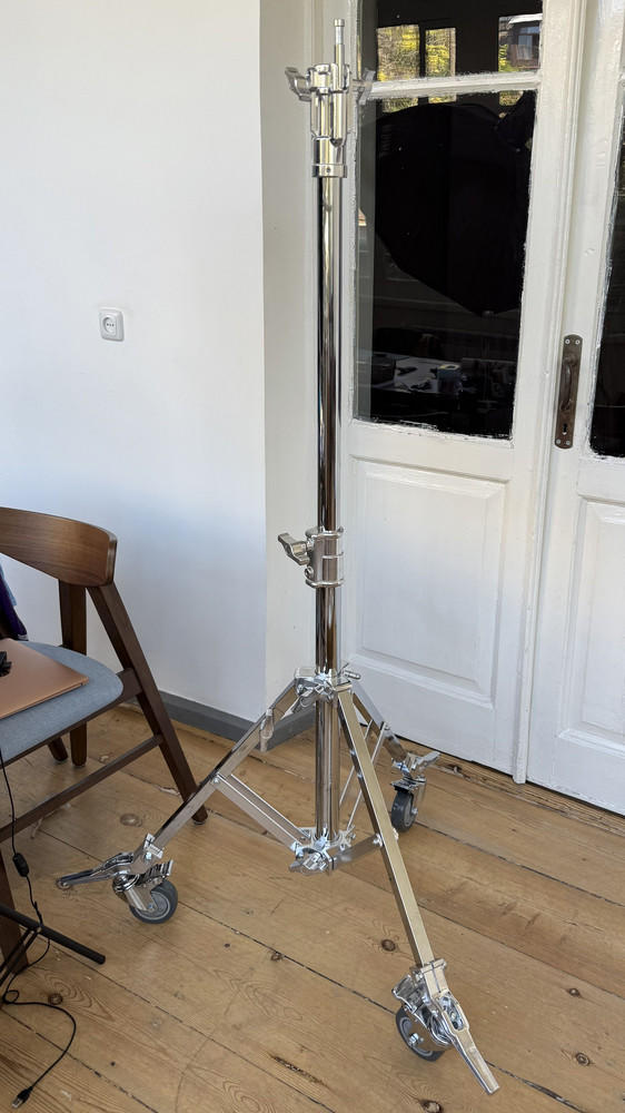 Высота стойки в рабочем состоянии от 92 см до 168 см обеспечивается выдвижением телескопической секции колонны с усиленными винтовыми зажимами. Секции колонны изготавливаются из трубы большого диаметра 42 и 48 мм, обеспечивающими высокую грузоподъемность. Секции оснащены пружинным амортизатором, который дает возможность безопасно поднимать и опускать установленное оборудование на необходимую высоту, не опасаясь последствий падения оборудования из-за случайного ослабления зажимов.