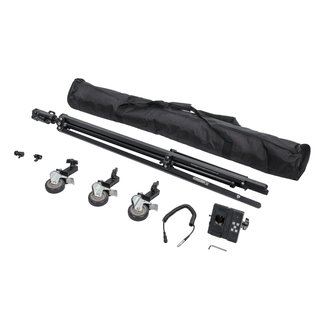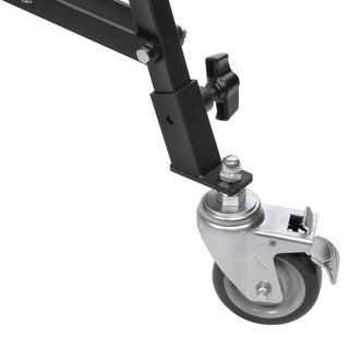Съемные колеса диаметром 100 мм с тормозами обеспечивают быструю и контролируемую перестановку стойки с оборудованием по гладкому покрытию павильона. В сложенном виде, после демонтажа колес, высота конструкции составляет 151 см. Для защиты от повреждений при перевозке и хранении в комплект включен транспортный чехол.