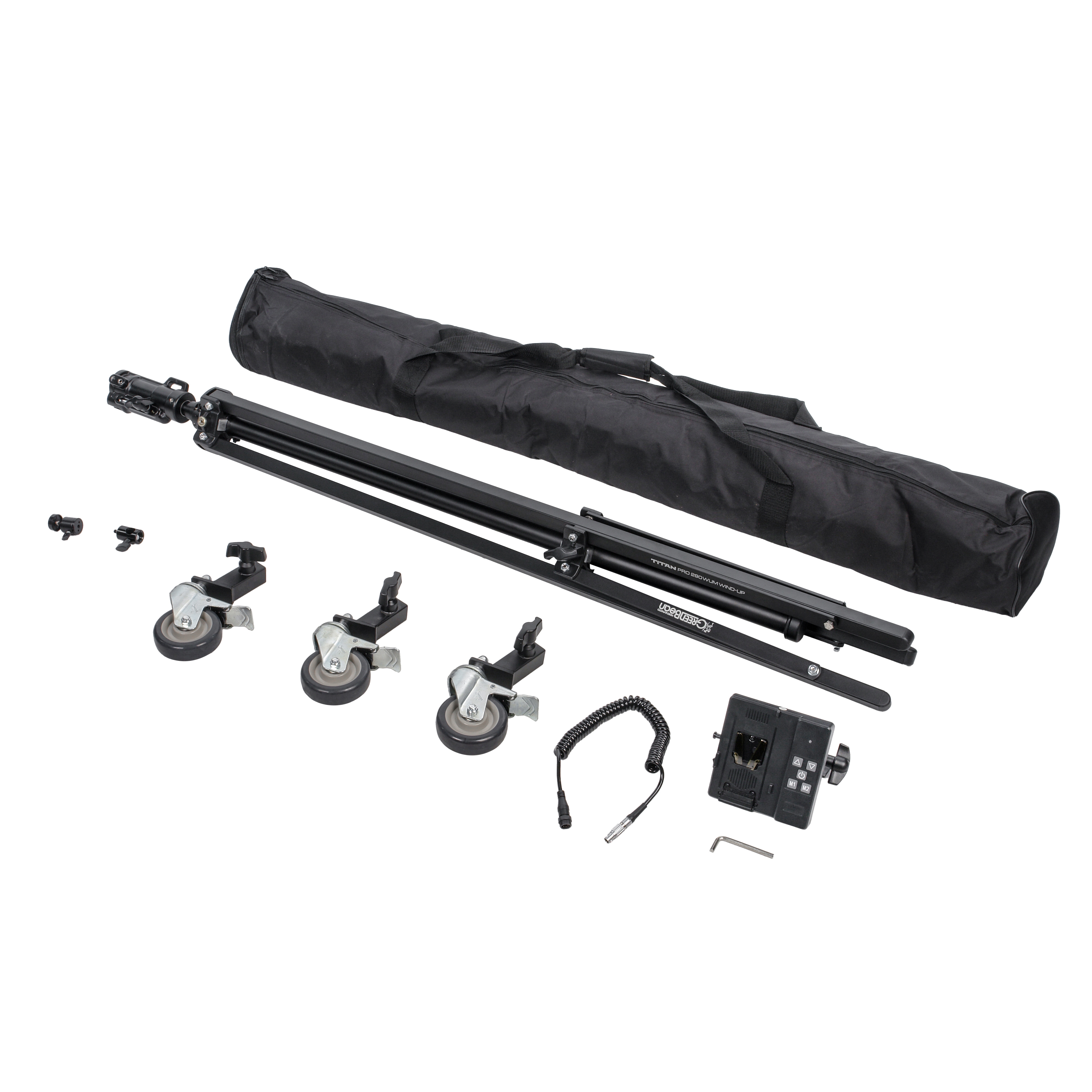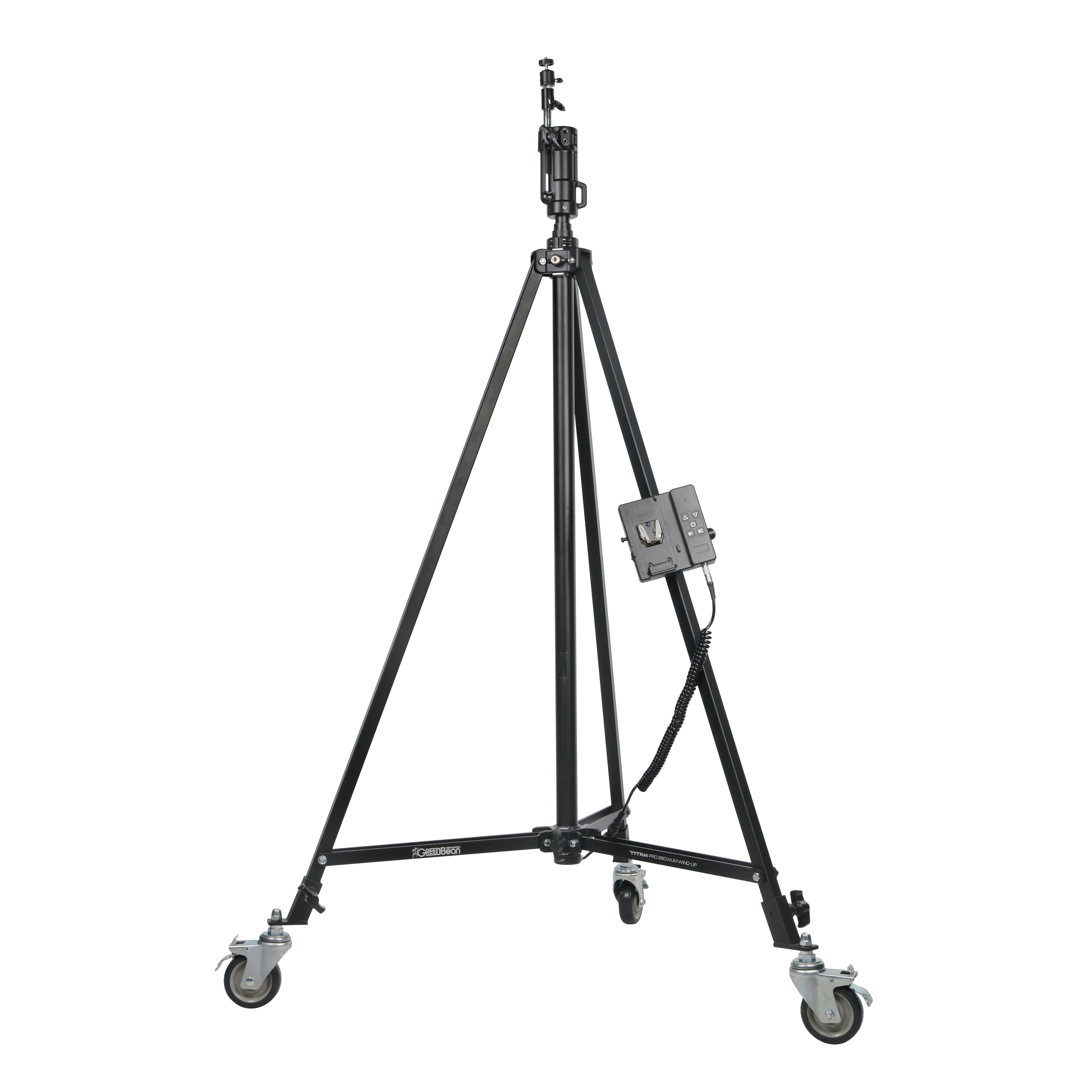 GreenBean Titan PRO 290WUM WIND-UP – моторизованная стойка на колесах с шаровой мини-головкой для крепления цифровой камеры. Телескопическая алюминиевая колонна на стальной треноге со съемными колесами обеспечивает мобильность на съемочной площадке. Электропривод подъемной колонны управляется с проводного пульта с питанием от аккумулятора V-mount.