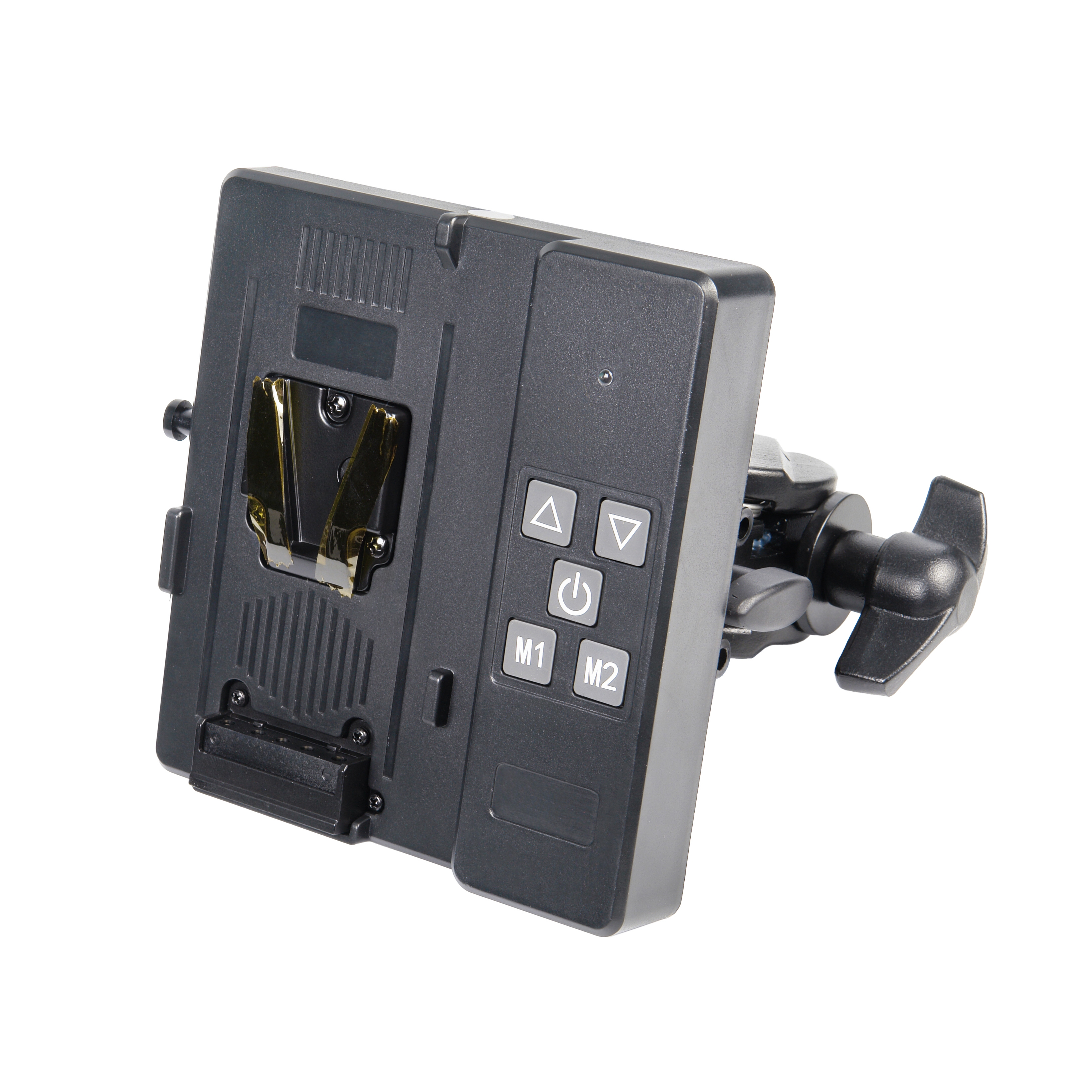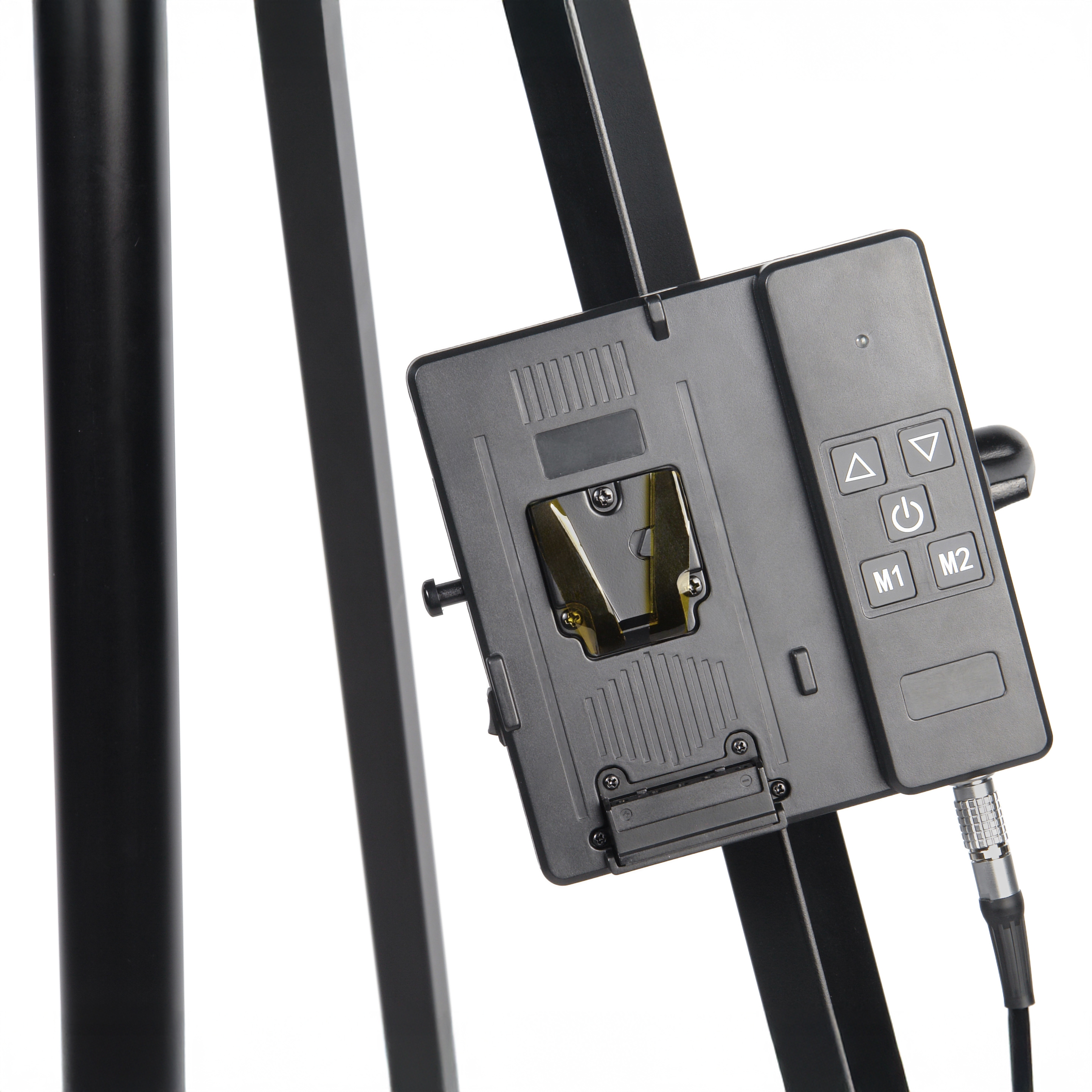 Проводной пульт управления с креплением на стойку питается от аккумулятора V-mount (12-16.8В, приобретается отдельно), исключая зависимость от розетки на выездной съемке. Запись двух пользовательских высот (M1 и M2) позволяет моментально возвращаться к точным позициям для съемки повторов, смены объектива или тонкой перестройки световой схемы. Звуковой сигнал на пульте информирует о достижении крайних верхнего и нижнего положений колонны.