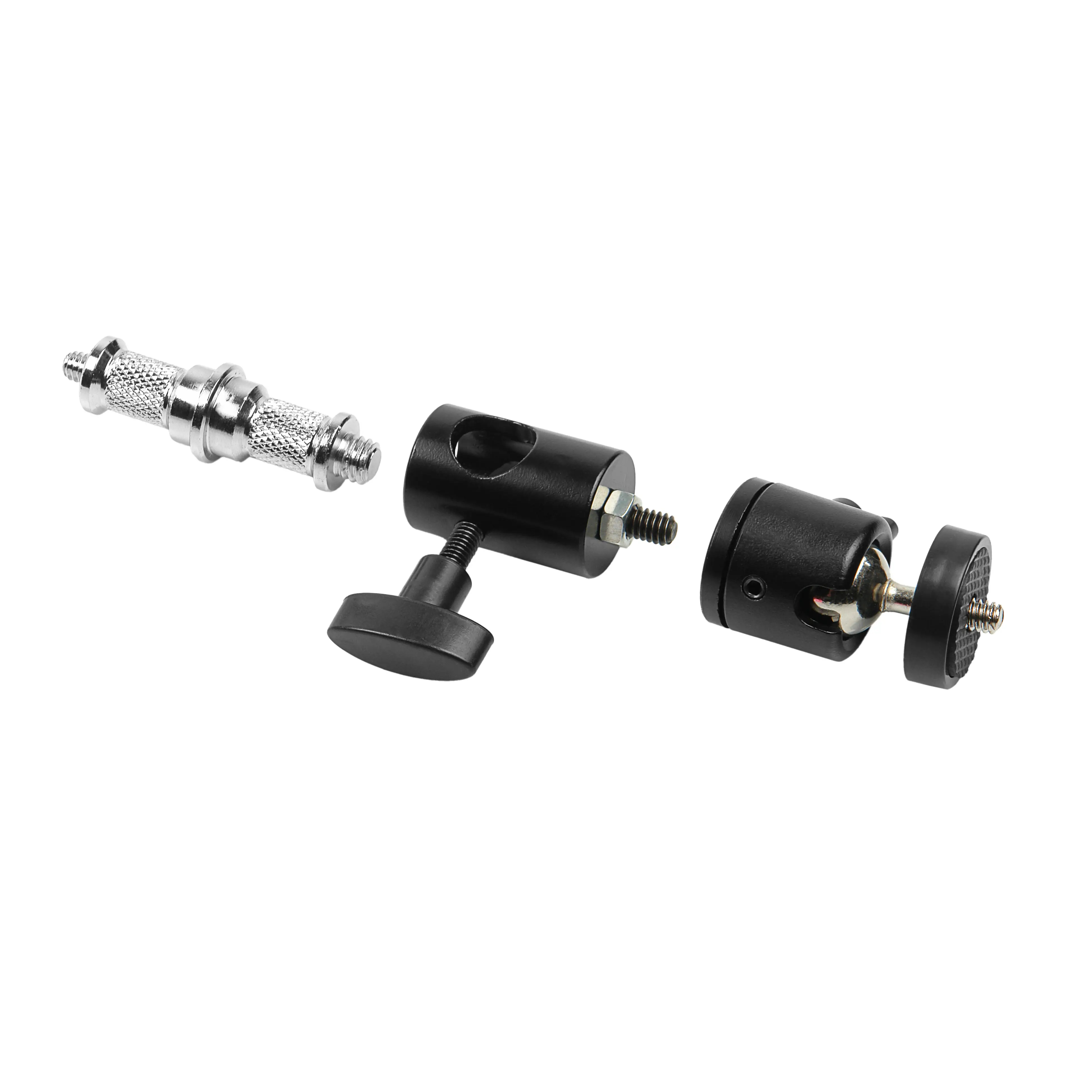 На перекладине установлен съемный двусторонний шпигот 16 мм с резьбами 1/4” и 3/8”, а также шаровая мини-головка. Штифт можно установить как вдоль, так и поперек журавля в одно из отверстий на конце перекладины, что расширяет варианты крепления оборудования.