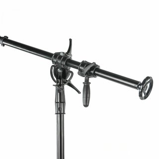 Все основные узлы стойки и перекладины изготовлены из высокопрочной стали, что гарантирует максимальную жесткость конструкции и отсутствие люфтов даже при полном вылете стрелы. Секции стойки диаметром 40/35 мм и перекладины 35/30 мм гарантируют оптимальное соотношение прочности и минимального веса. Металлическое исполнение критических элементов — зажимов, соединительной муфты и кронштейна противовеса — обеспечивает долговечность эксплуатации в интенсивном студийном режиме.