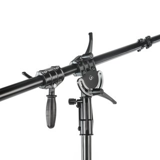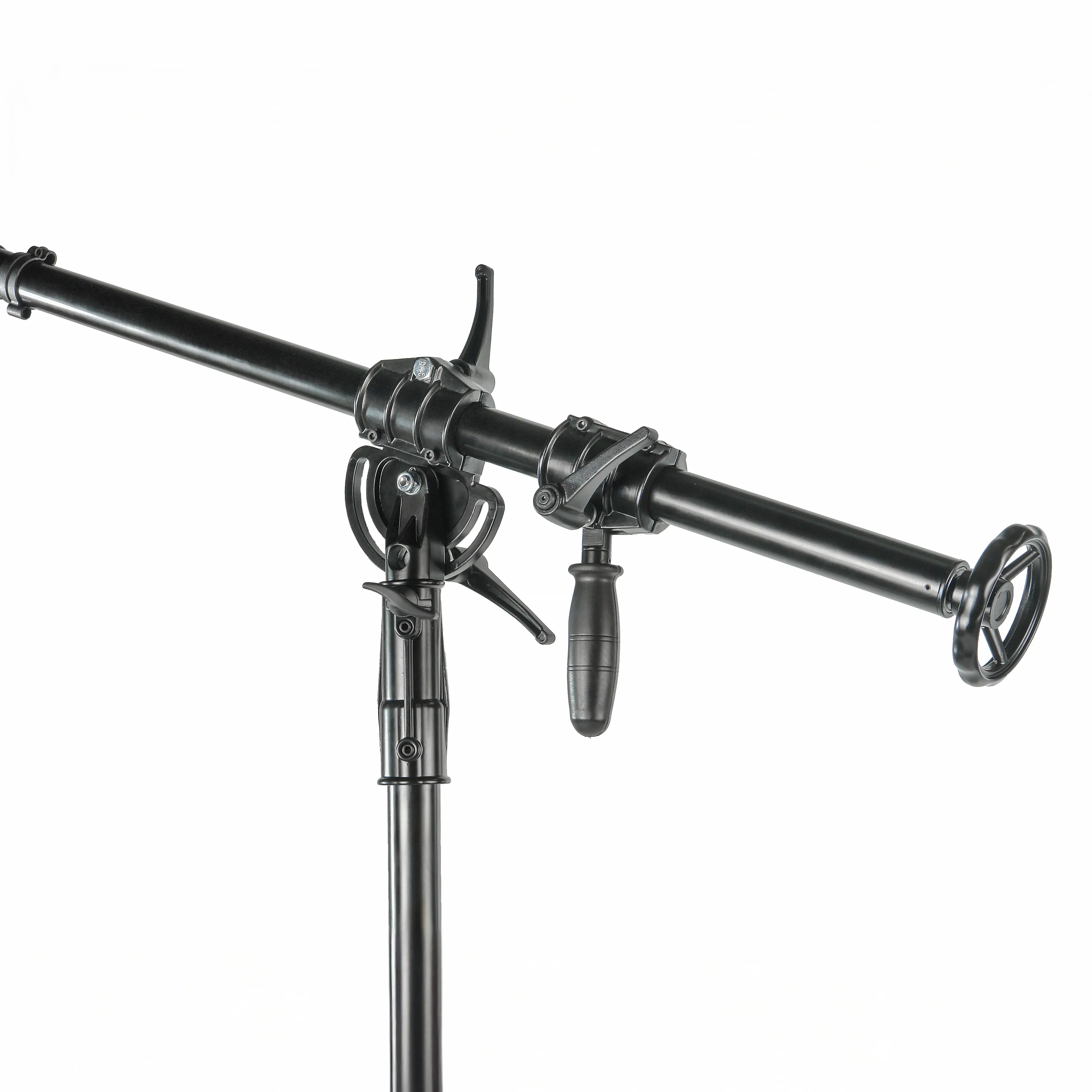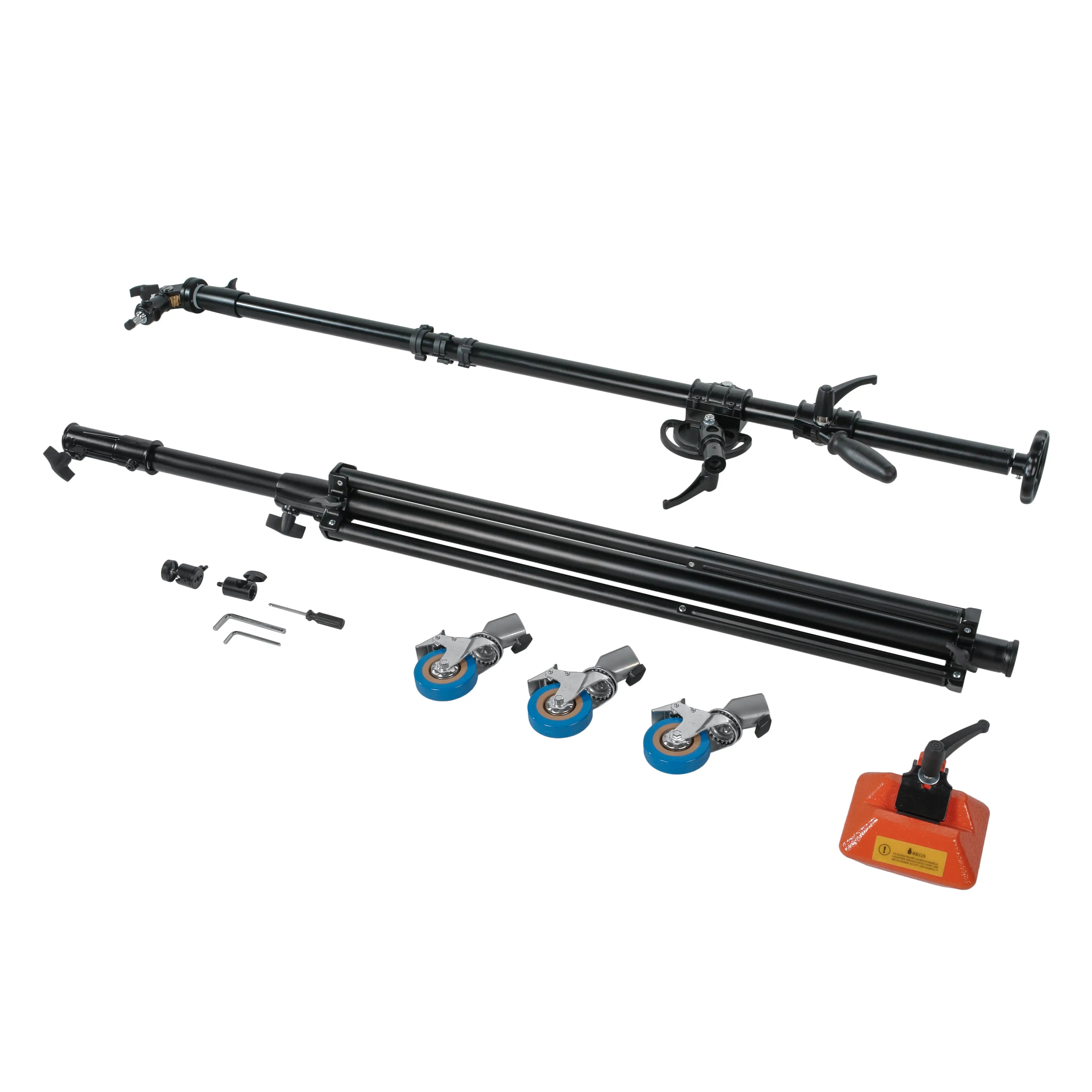 Двухсекционная перекладина-журавль плавно выдвигается от 145 до 250 см, обеспечивая точное позиционирование камеры над объектом съемки. Для удобного подъема и опускания стрелы предусмотрена эргономичная рукоятка на одном из узлов перекладины. Вдоль всей конструкции расположены кабельные скобы для аккуратной фиксации и организации кабелей и проводов питания, что предотвращает их запутывание и повреждение во время регулировок. Комплектный груз-противовес массой 6 кг гарантирует безопасную работу с вынесенной нагрузкой, предотвращая опрокидывание конструкции.