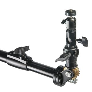 На конце перекладины расположен червячный механизм с поворотным колесом, управляющий положением наконечника журавля со съемным шпиготом с резьбой 1/4" и 3/8". Поворотное колесо на противоположном конце стрелы обеспечивает плавный и точный разворот крепежного узла на 170° без люфтов. На шпигот устанавливается шаровая мини-головка, которая позволяет фиксировать камеру в любом положении.