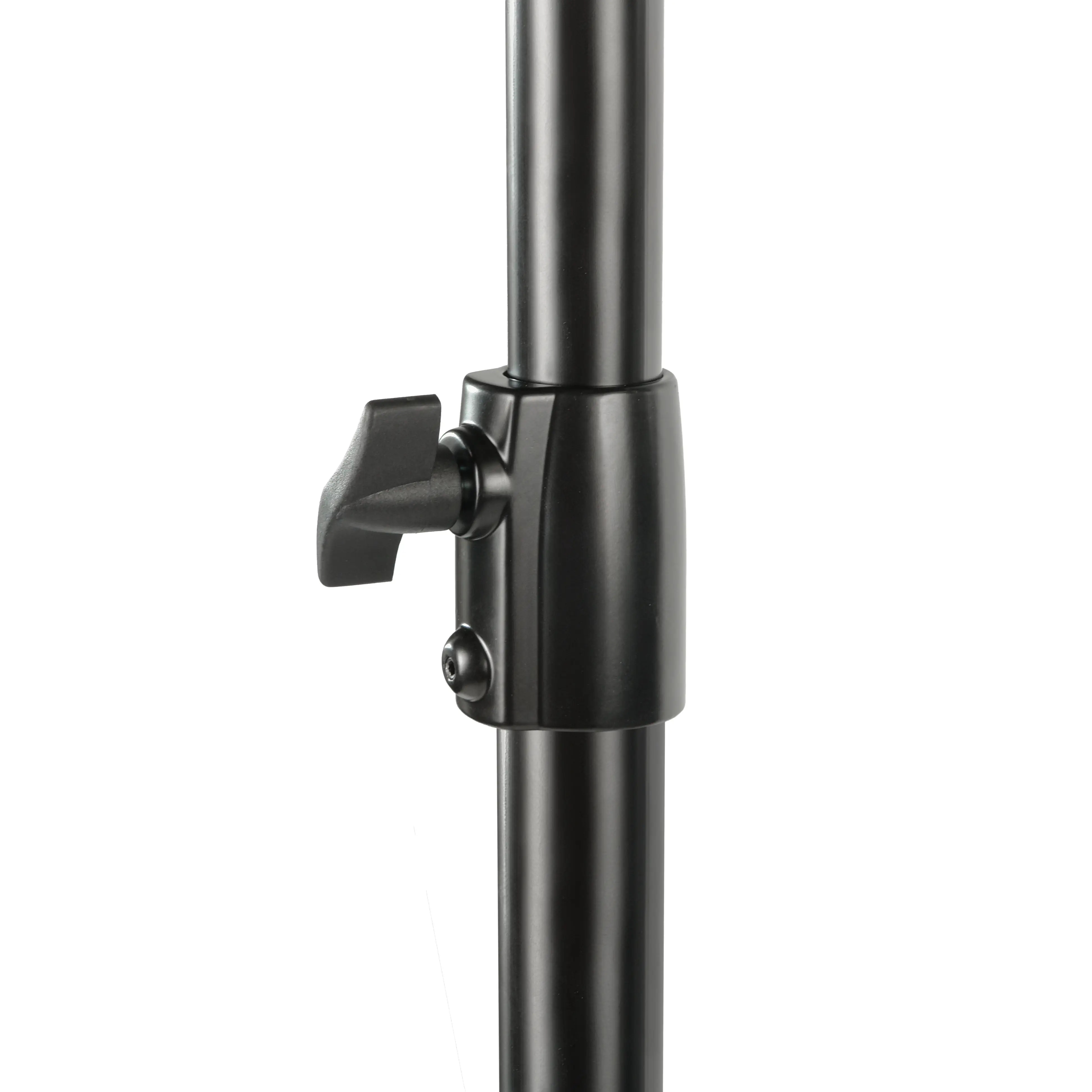 Конструкция стойки представляет собой телескопическую двухсекционную колонну, установленную на прочную треногу с размахом ног 120 см. Высоту стойки можно плавно регулировать от 110 до 218 см. Пружинная амортизация секций гарантирует дополнительную безопасность: при случайном ослаблении фиксатора механизм предотвращает резкое падение оборудования.