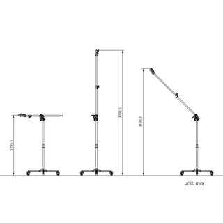 Легко превращается из классической стойки на колесах в Junior-журавль: достаточно вынуть центральную колонну и зафиксировать её под нужным углом с помощью поворотного зажима. Для работы с тяжелыми приборами и удобной балансировки в режиме журавля предусмотрена выдвижная ножка (ход 12 см), а выравнивающая ножка стабилизирует конструкцию на неровном полу или грунте. Один конец стойки оснащен отверстием Ø14 мм для установки противовесов, другой — универсальной головкой с гнёздами 1-1/8" (28 мм) и 5/8" (16 мм), а также многонаправленным штифтом 5/8" (16 мм). Стойка изготовлена из хромированной стали, рассчитанной на интенсивную эксплуатацию, литая алюминиевая рукоятка и болт из нержавеющей стали повышают надежность, а литое колено с резьбовой вставкой heli-coil гарантирует прочное соединение.