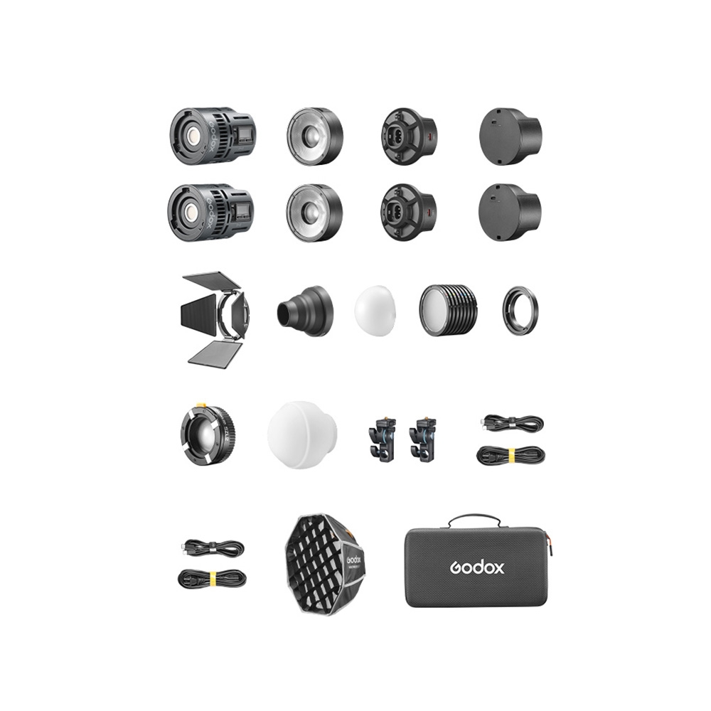 Комплект студийного оборудования Godox RS60R 2K из двух компактных полноцветных светодиодных осветителей RS60R с аккумуляторами и различных светоформируюших насадок позволит создать спотовое освещение для проведения фотосъемки, прямых трансляций, видеоинтервью и блогов.