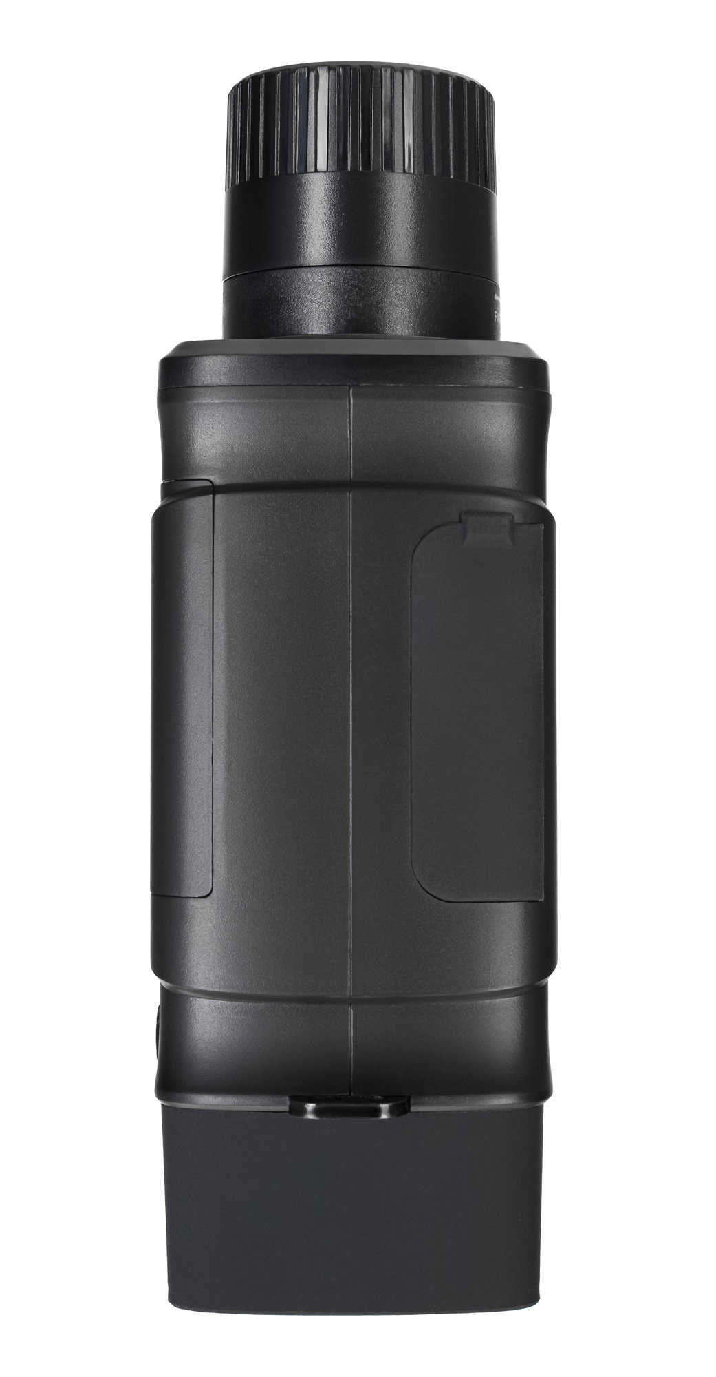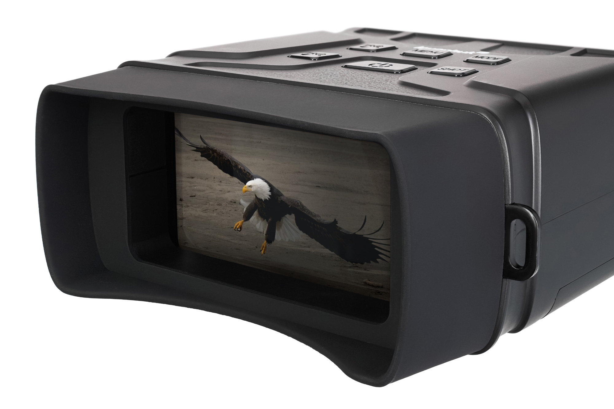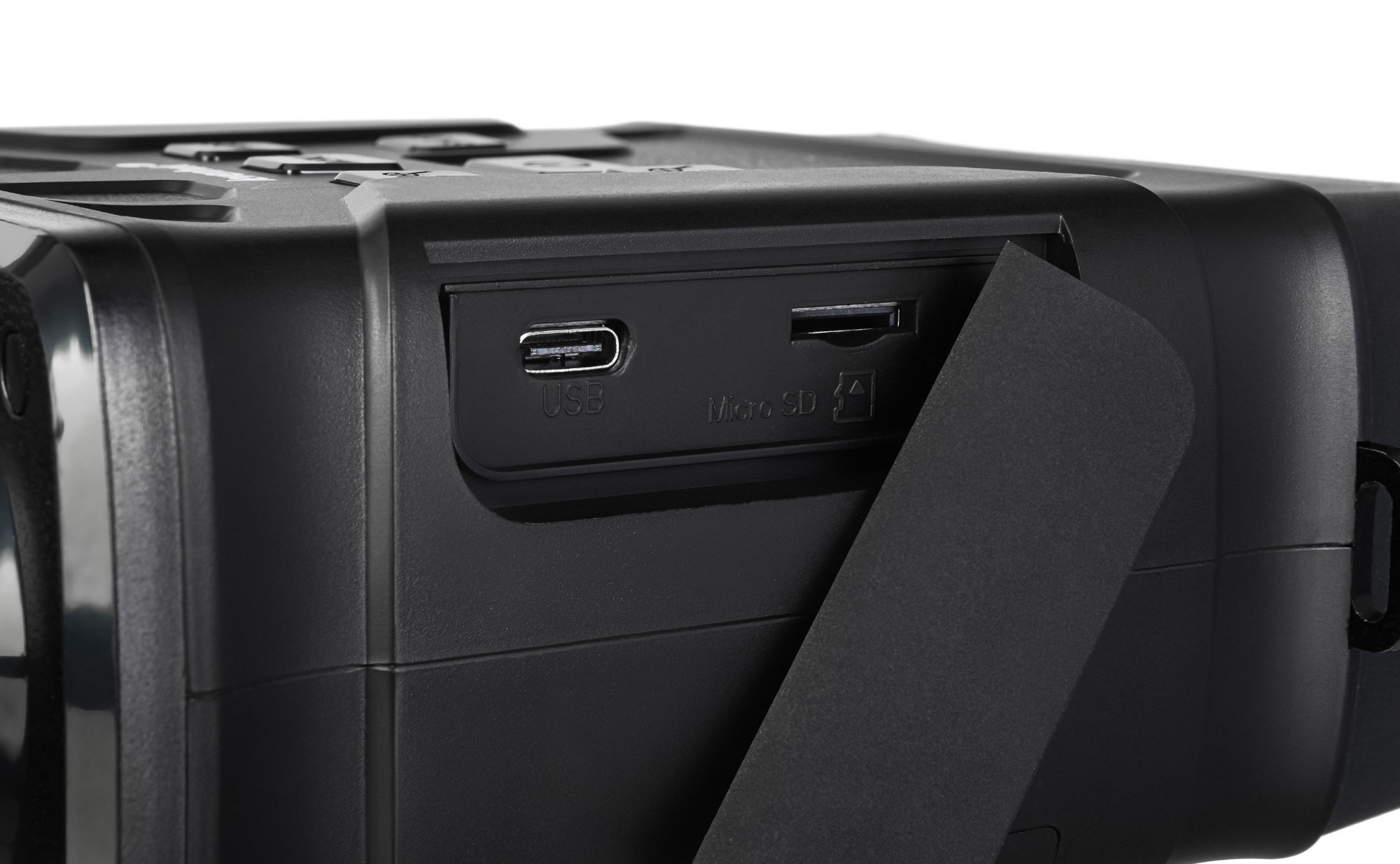 Окулярные линзы бинокля имеют выпуклую форму, благодаря чему изображение на встроенном дисплее дополнительно увеличивается, что позволяет изучать цели в мелких подробностях. Оптика прибора сделана из стекла, корпус – из высокопрочного пластика. В качестве светочувствительного элемента в бинокле используется CCD-матрица. Дальность обнаружения в светлое время суток ничем не ограничивается, а в полной темноте она составляет 250–300 метров. ИК-подсветка работает от аккумуляторов – до 6 часов на одном заряде, яркость настраивается в широком диапазоне.