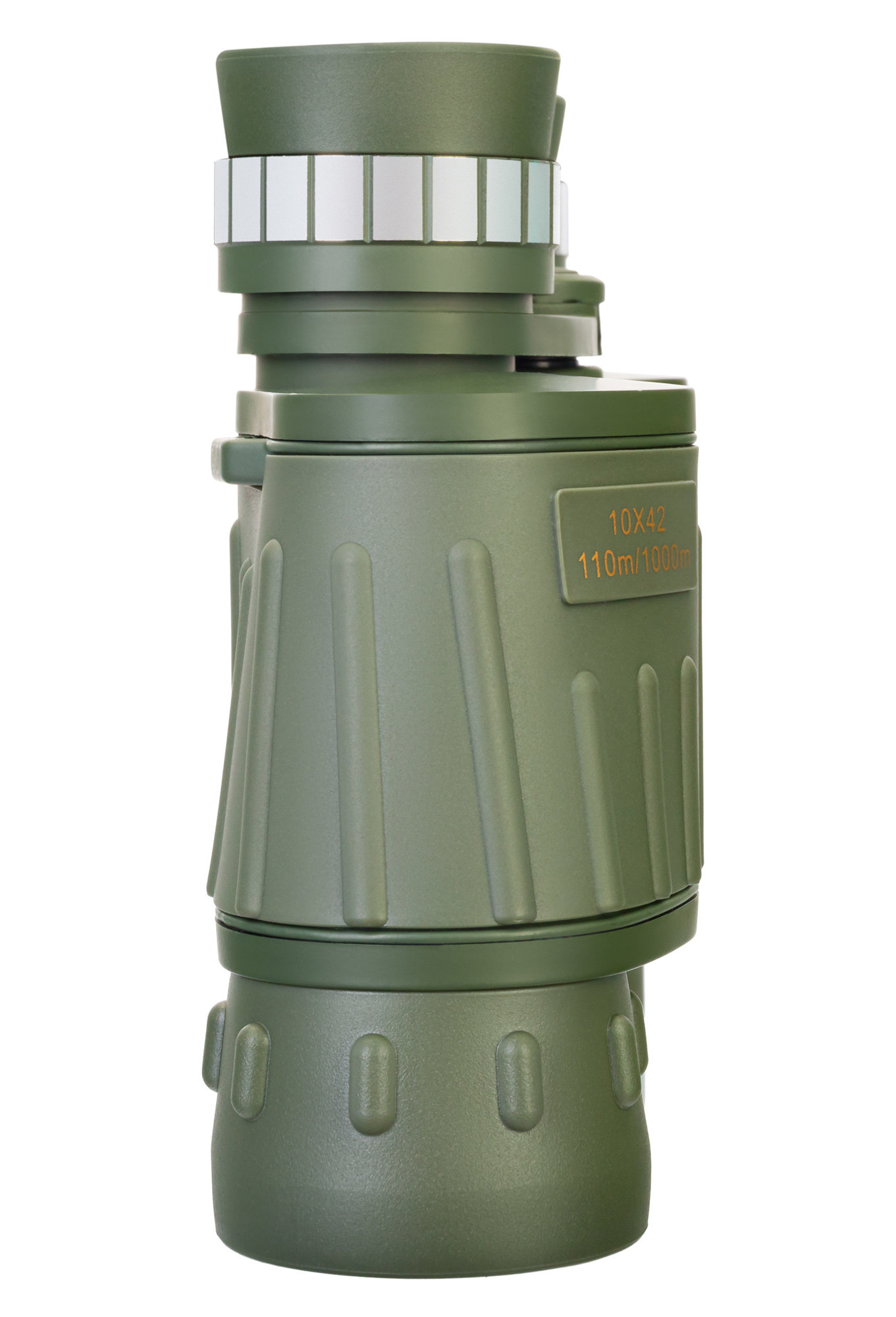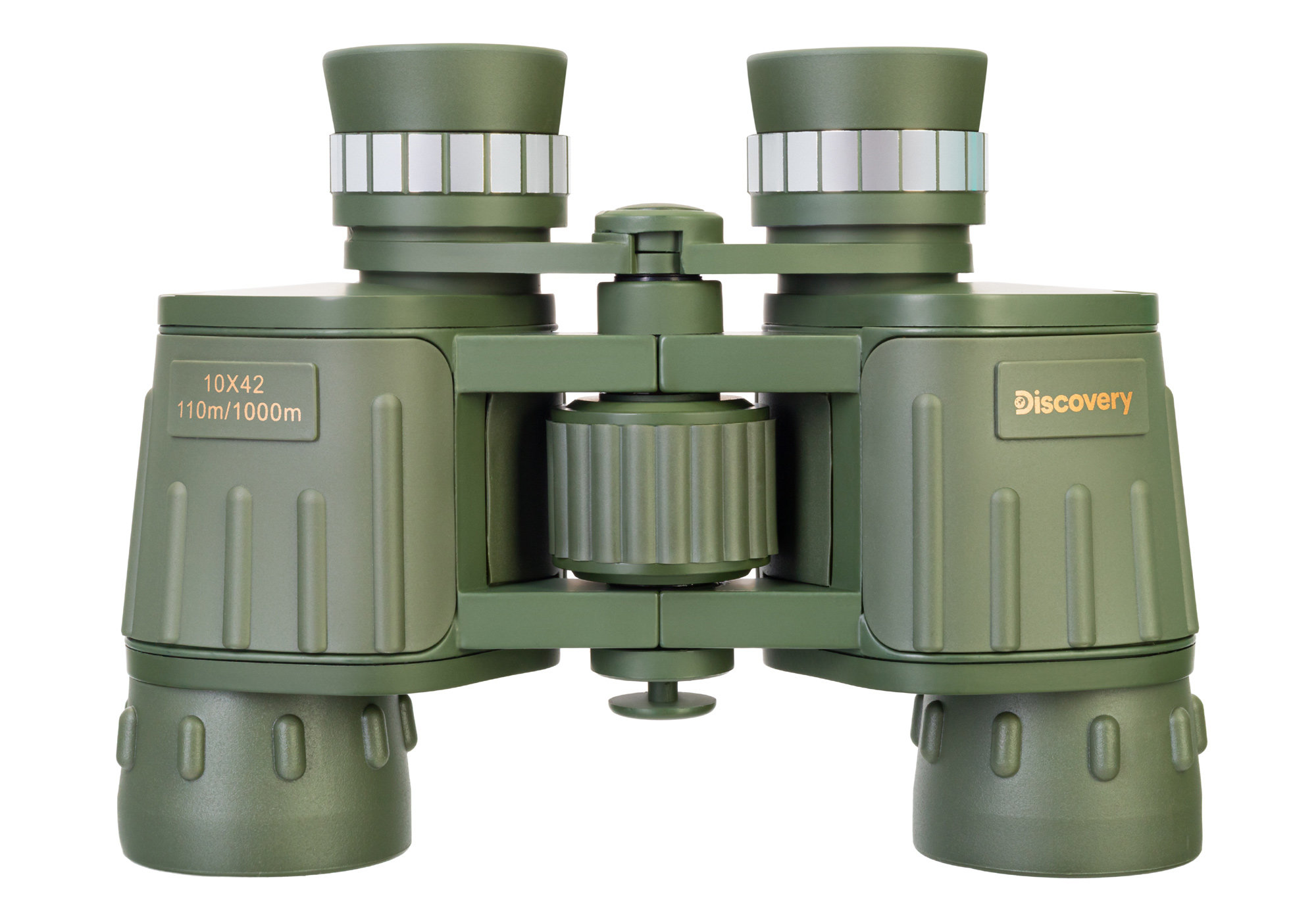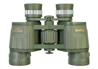 Модель Levenhuk Discovery Field 10x42 легче, чем многие другие полевые бинокли с аналогичными параметрами, так как ее корпус изготовлен пластика. Он прочный и обрезиненный – оптико-механические элементы бинокля надежно защищены от повреждений и влаги. Внешнее покрытие повышает надежность хвата благодаря своей рифленой поверхности. Объективы наводятся на резкость одновременно с помощью центрального барабана, при необходимости можно скорректировать диоптрии. Для долгих наблюдений бинокль можно установить на штатив: в конструкции предусмотрено гнездо стандартного диаметра.