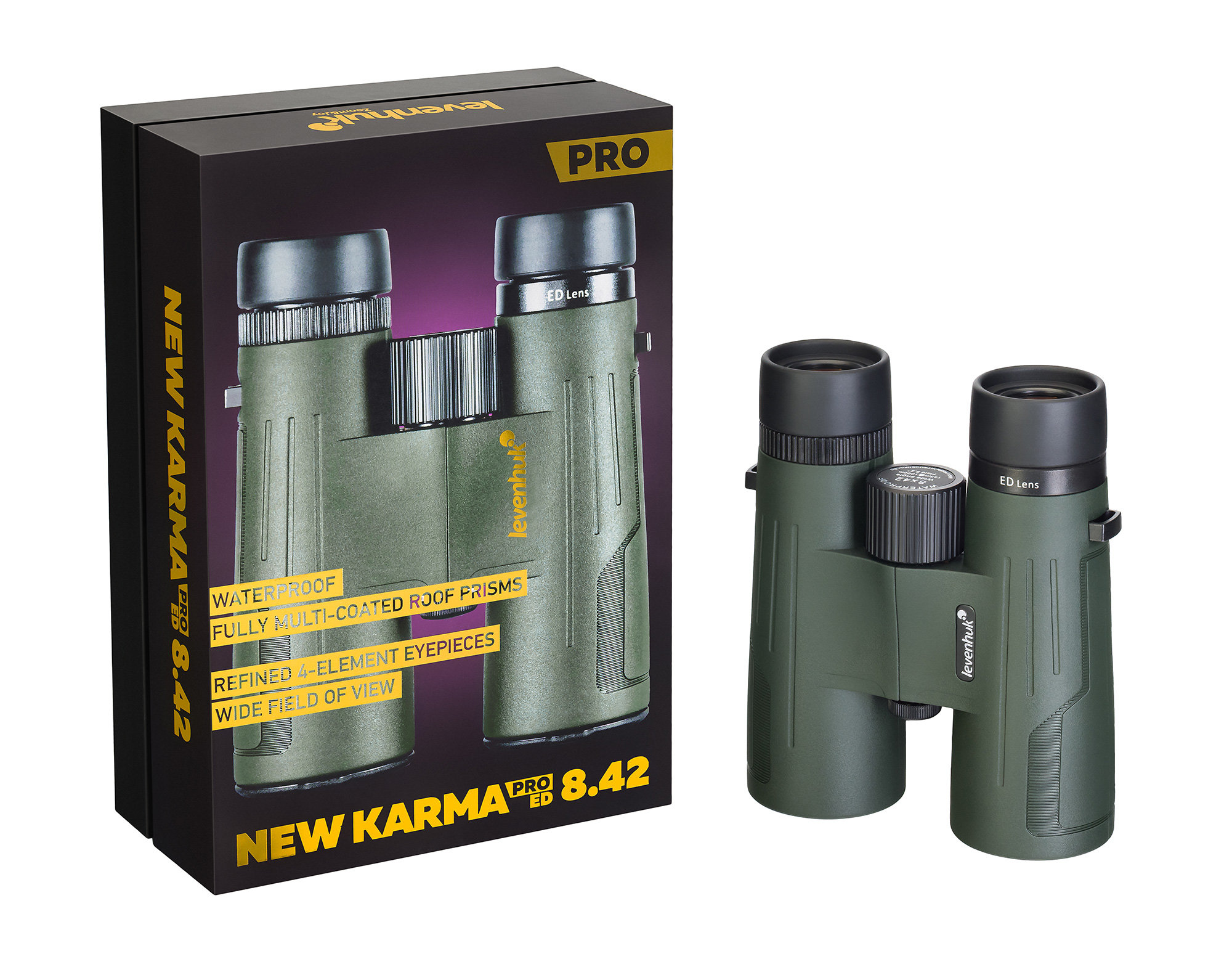 Levenhuk New Karma PRO ED 8x42 – прибор, который подходит пользователям с особенностями зрения и носящим очки на регулярной основе. В нем предусмотрена функция диоптрийной коррекции ±4 D, а также регулировка выноса выходного зрачка поворотом наглазников. Наглазники можно зафиксировать в одном из трех положений, определяемых на слух – по щелчку.