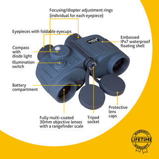 Особенность этой модели – встроенные дальномер и компас. Шкалы приборов видны в окулярах, можно сразу измерить видимый объект и определить его положение. Для удобства наблюдений в темноте у компаса есть светодиодная подсветка с питанием от батареек. Компас показывает направление на объект, выраженное в градусах угла. Север находится на отметке 360°, юг – 180°, восток – 90° и запад – 270°.