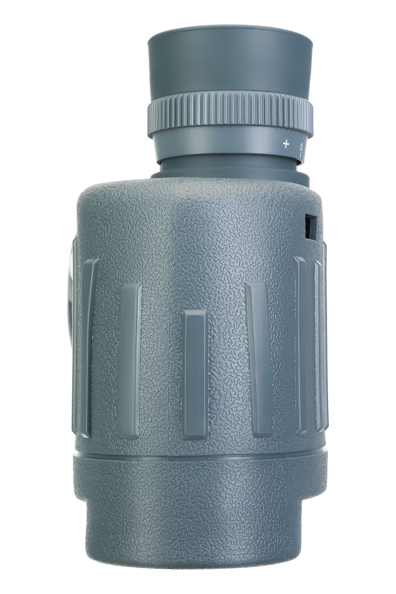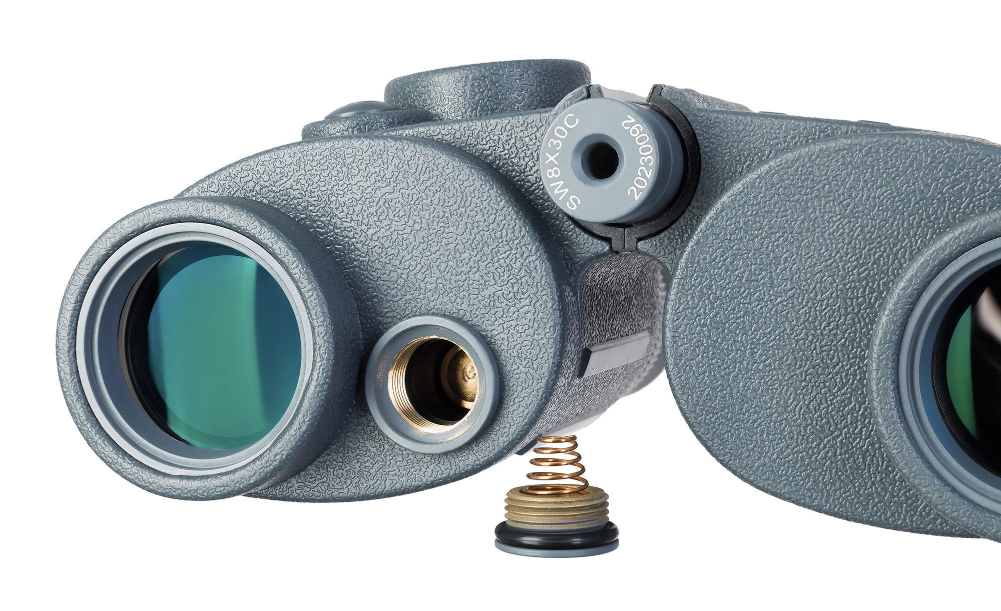 Бинокль заполнен азотом – это предотвращает запотевание линз. Складные наглазники окуляров позволяют скорректировать ширину поля зрения при наблюдении в очках. Для регулировки межзрачкового расстояния достаточно свести или развести оптические трубы. Окуляры фокусируются индивидуально, центрального механизма фокусировки у бинокля нет. В корпусе есть специальное крепление для установки прибора на штатив.