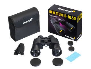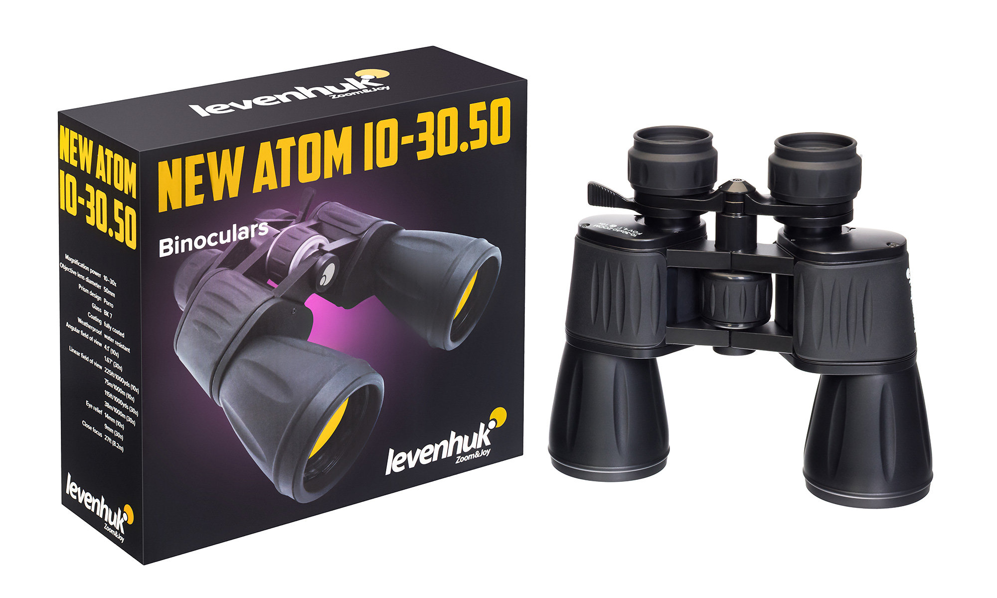 Бинокль Levenhuk New Atom 10–30x50 оснащен зумом (переменной кратностью) 10–30x, что выделяет модель из линейки. Оптическая схема при этом классическая, на Порро-призмах. Апертура прибора равна 50 мм, линзы изготовлены из боросиликатного крона марки BK-7, на который нанесено полное просветляющее покрытие. Базовое увеличение прекрасно подойдет для небольших дистанций наблюдения, а с помощью зума можно как следует рассмотреть мелкие объекты.