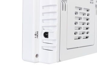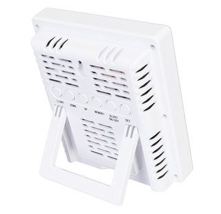 Все показания выводятся на встроенный экран в наглядной форме. Крупную индикацию легко увидеть даже с большого расстояния. Кнопки управления вынесены на заднюю крышку, чтобы не портить внешний вид прибора. Гигрометр можно установить на ровную поверхность при помощи подставки или повесить на стену – в корпусе предусмотрено специальное крепление. Для питания прибора требуется подключение к сети переменного тока (сетевой адаптер уже включен в комплектацию).