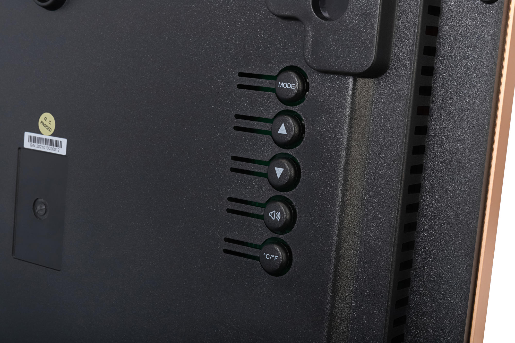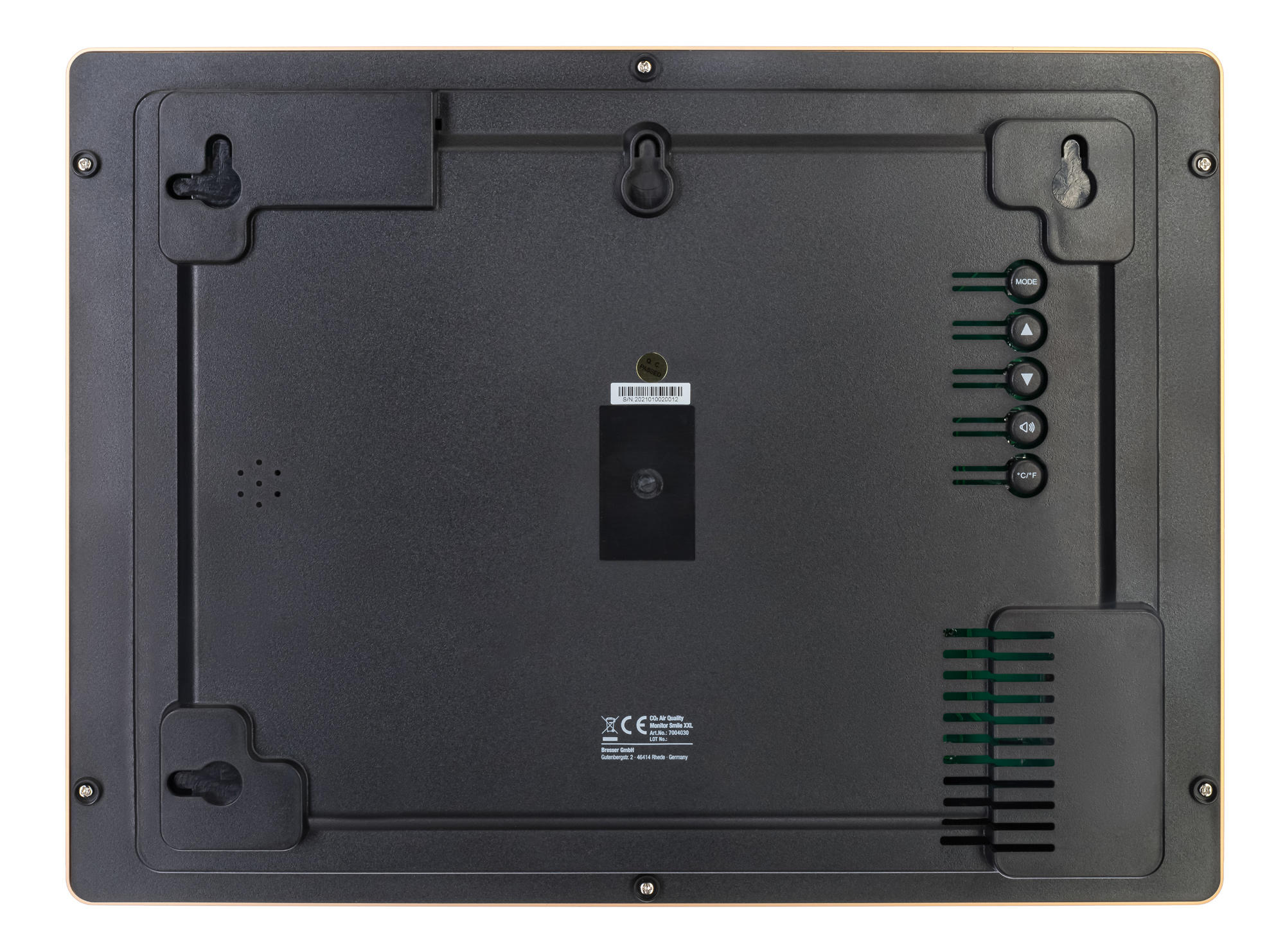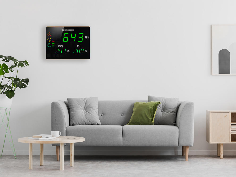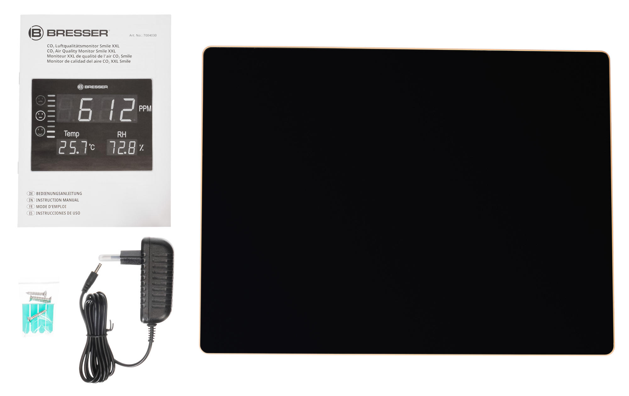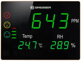 Гигрометр Bresser Air Quality Smile XXL сразу привлекает внимание своим современным и стильным дизайном. Корпус очень тонкий, высококонтрастный цветной экран не имеет рамок, индикация яркая и хорошо читаемая с большой дистанции. К тому же прибор определяет не только влажность воздуха, но также температуру и уровень углекислого газа в помещении. Также он предупреждает о предельных значениях – слишком высоких показателях, некомфортных для человека.