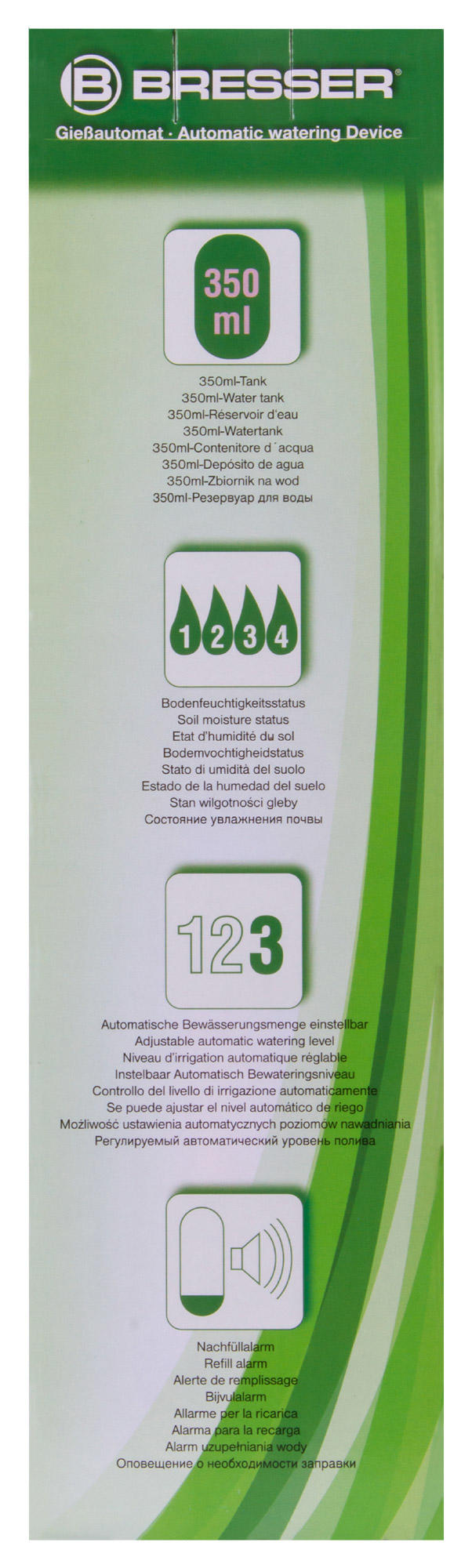 Устройство автоматического полива растений Bresser предназначено для контроля уровня влажности почвы у горшочных растений. В нижней части расположен сенсор, который постоянно информирует о состоянии растения, в верхней – резервуар для воды объемом 350 мл. Вы выбираете режим полива, все остальное прибор берет на себя. Если вода в резервуаре подойдет к концу, устройство своевременно оповестит вас об этом.