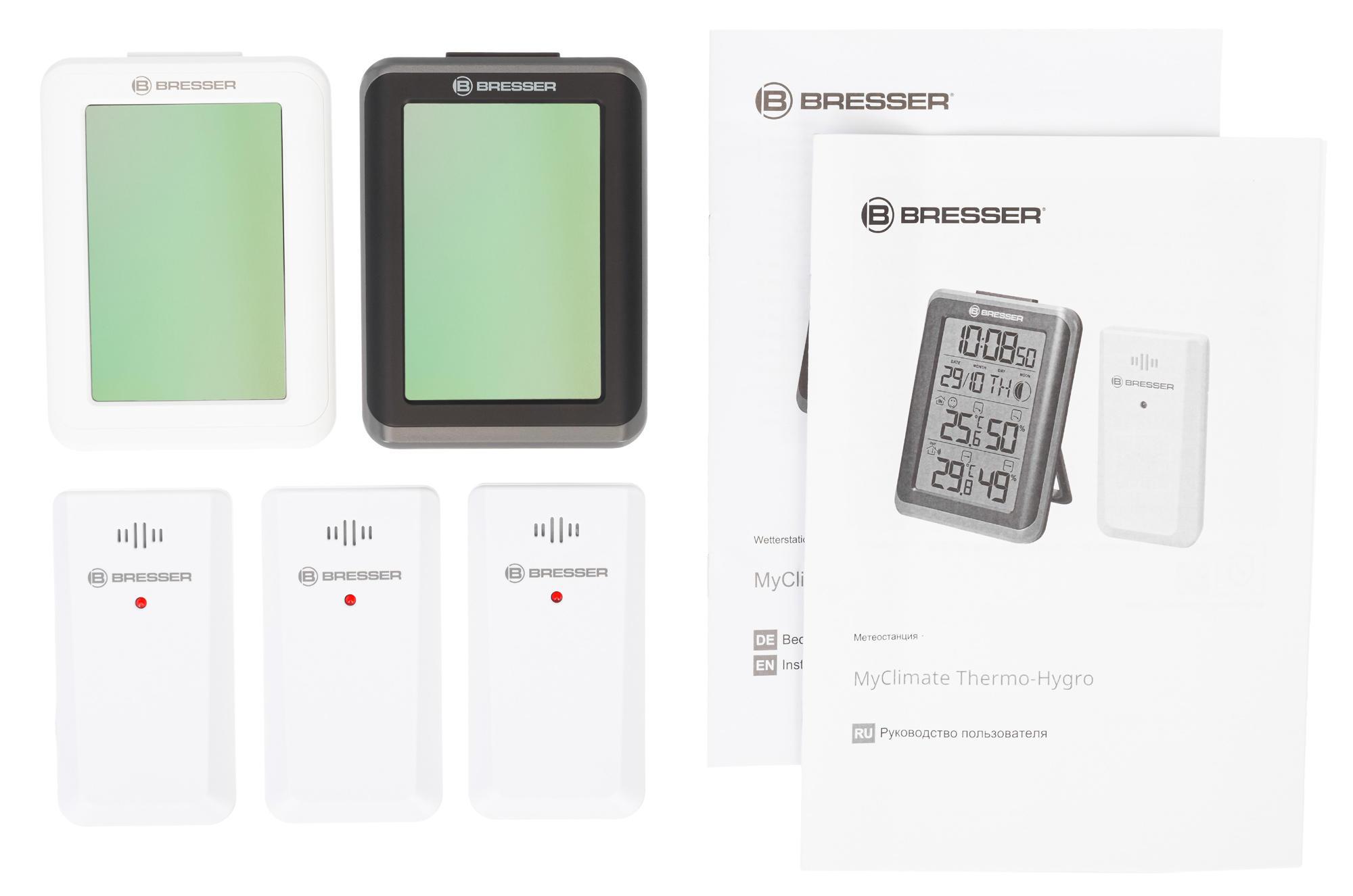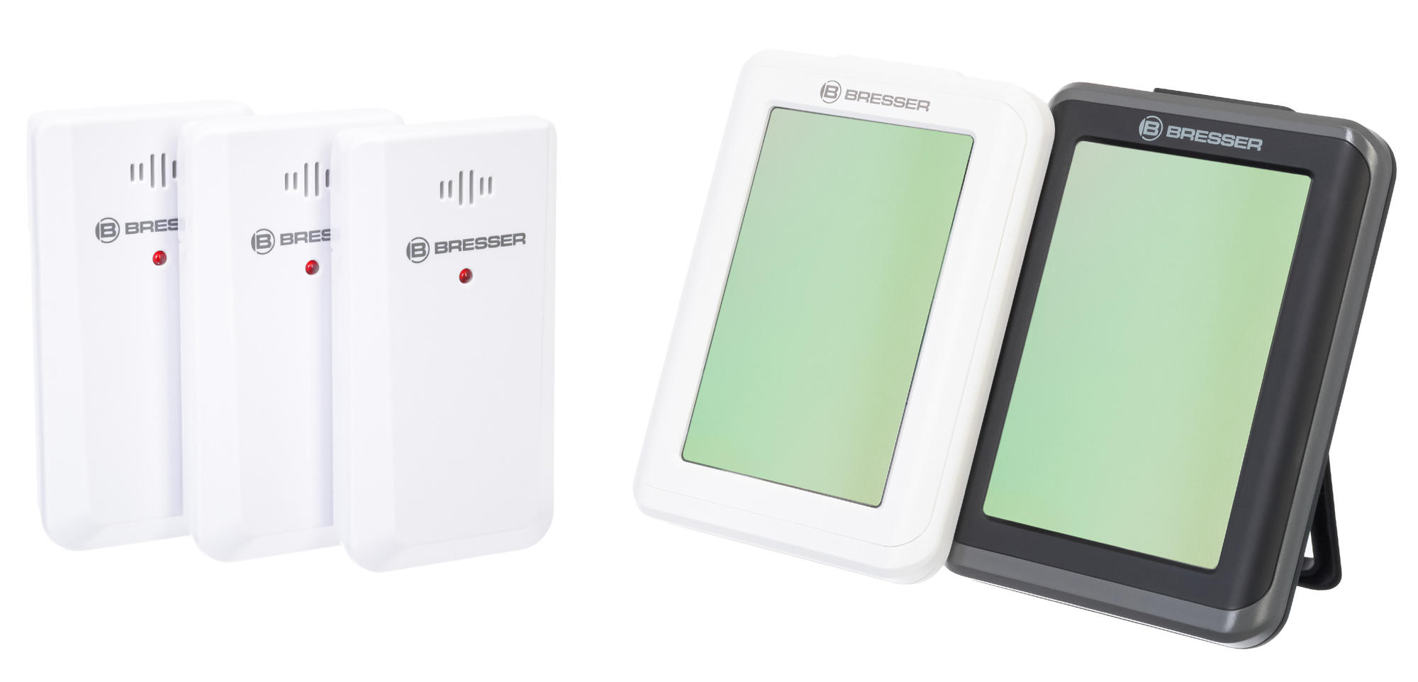 В набор Bresser Clima Temp IO Jumbo входят два термогигрометра и три наружных датчика. Вместе они позволят вести наблюдения за метеоизменениями в пяти точках одновременно. На каждом гигрометре можно увидеть показания всех подключенных датчиков. Расстояние между датчиком и гигрометром может составлять до 50 метров.