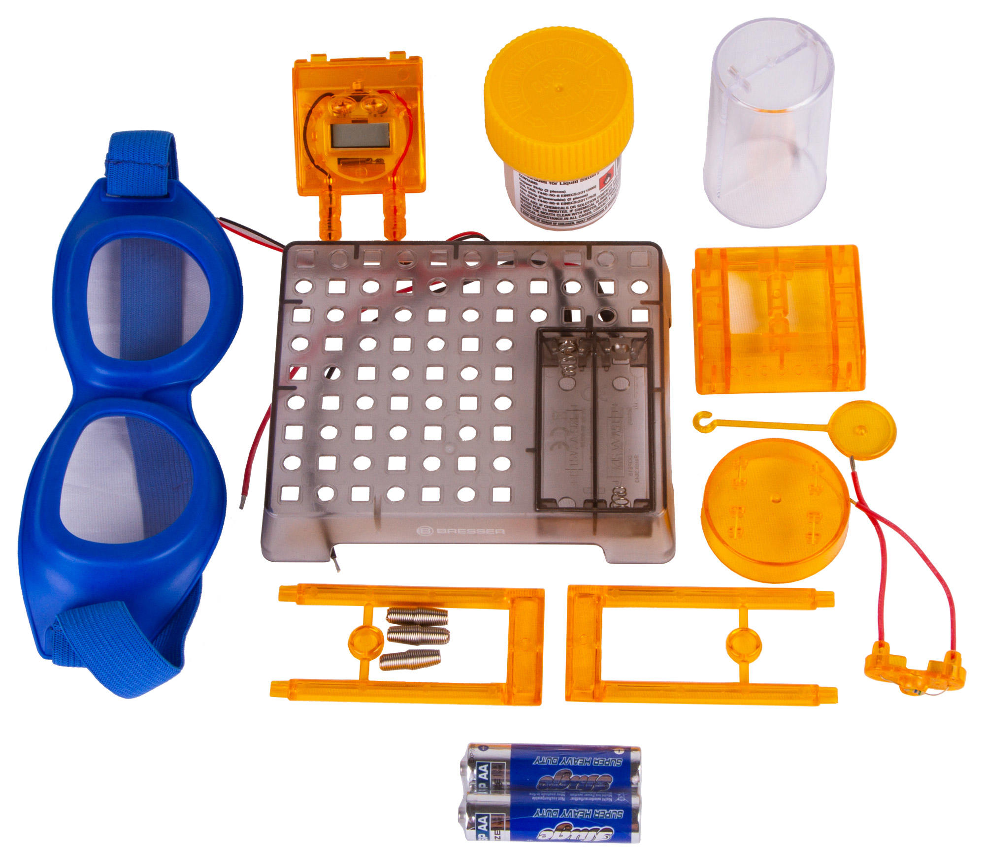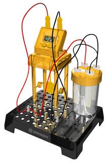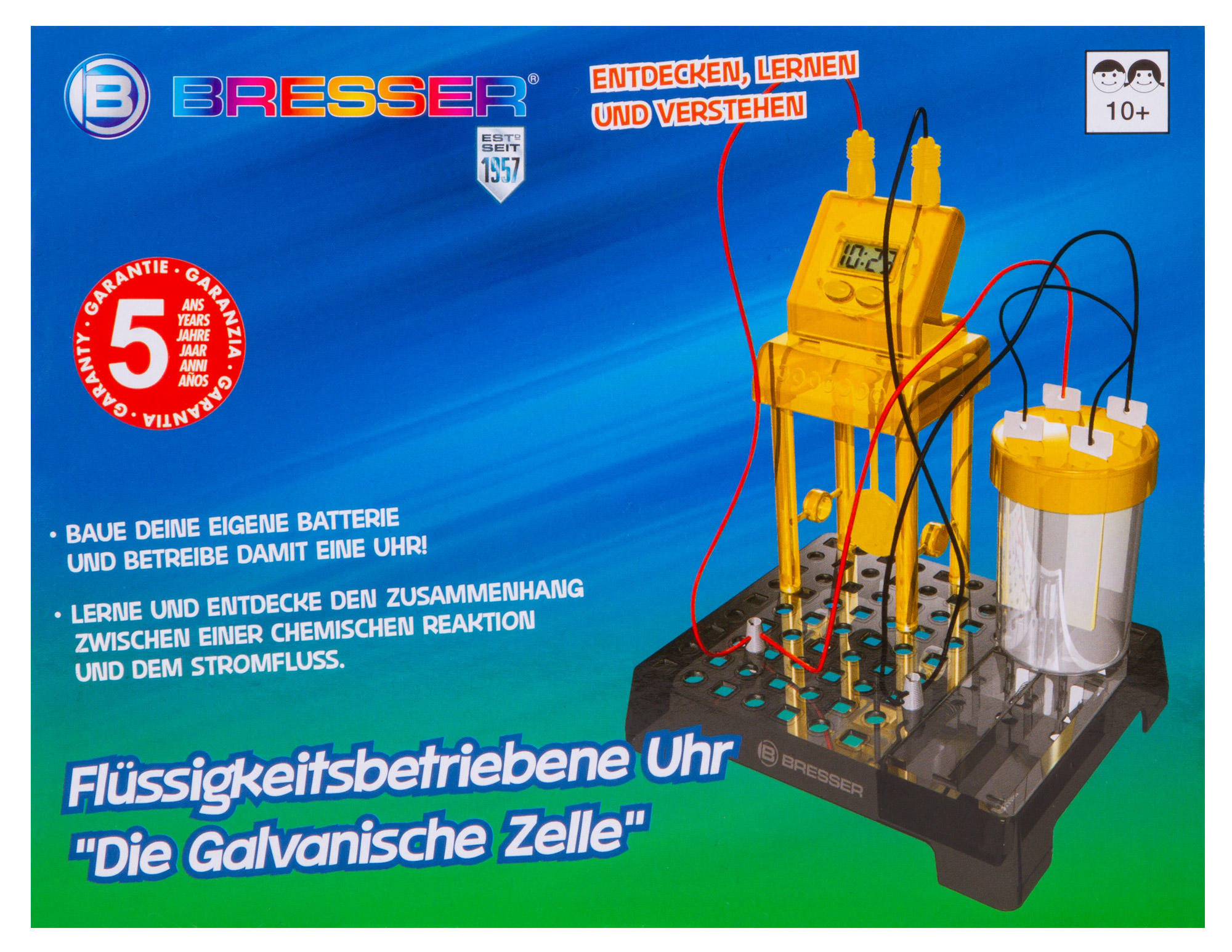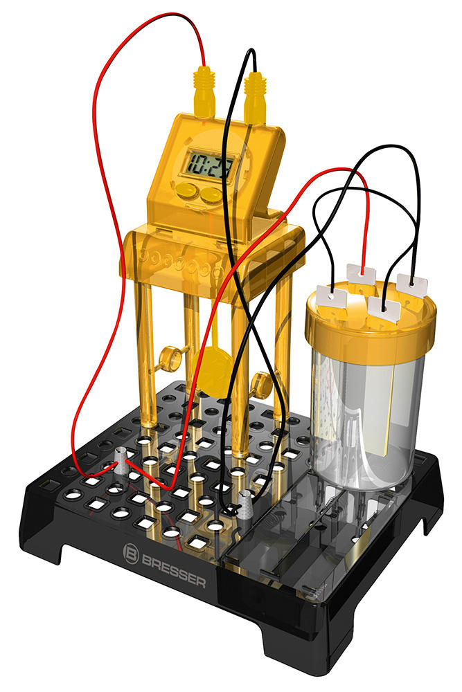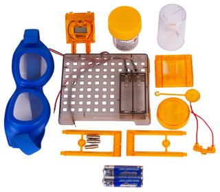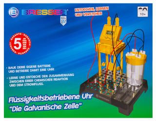Набор Bresser Junior «Часы на жидкостном аккумуляторе» познакомит юного исследователя с основами химии и физики и даст возможность увидеть, как химическая реакция между двумя металлами может привести к возникновению в цепи электричества. С помощью этого набора можно собрать работающий аккумулятор и подключить его к цифровым часам, которые станут показывать время и текущую дату. Сама сборка несложная, все шаги подробно описаны в прилагаемом руководстве.