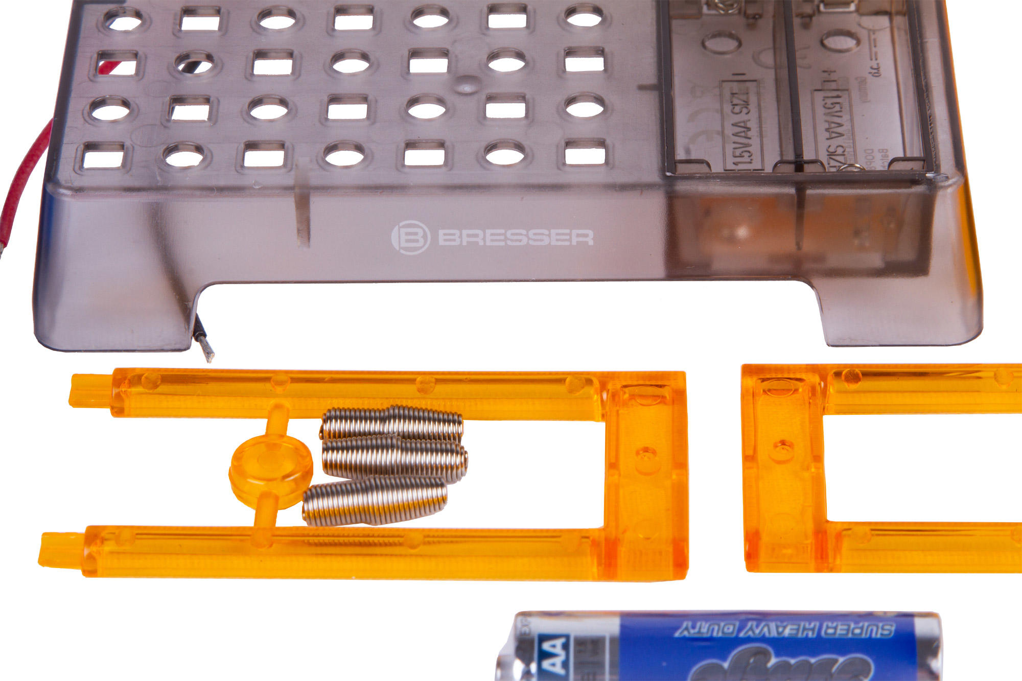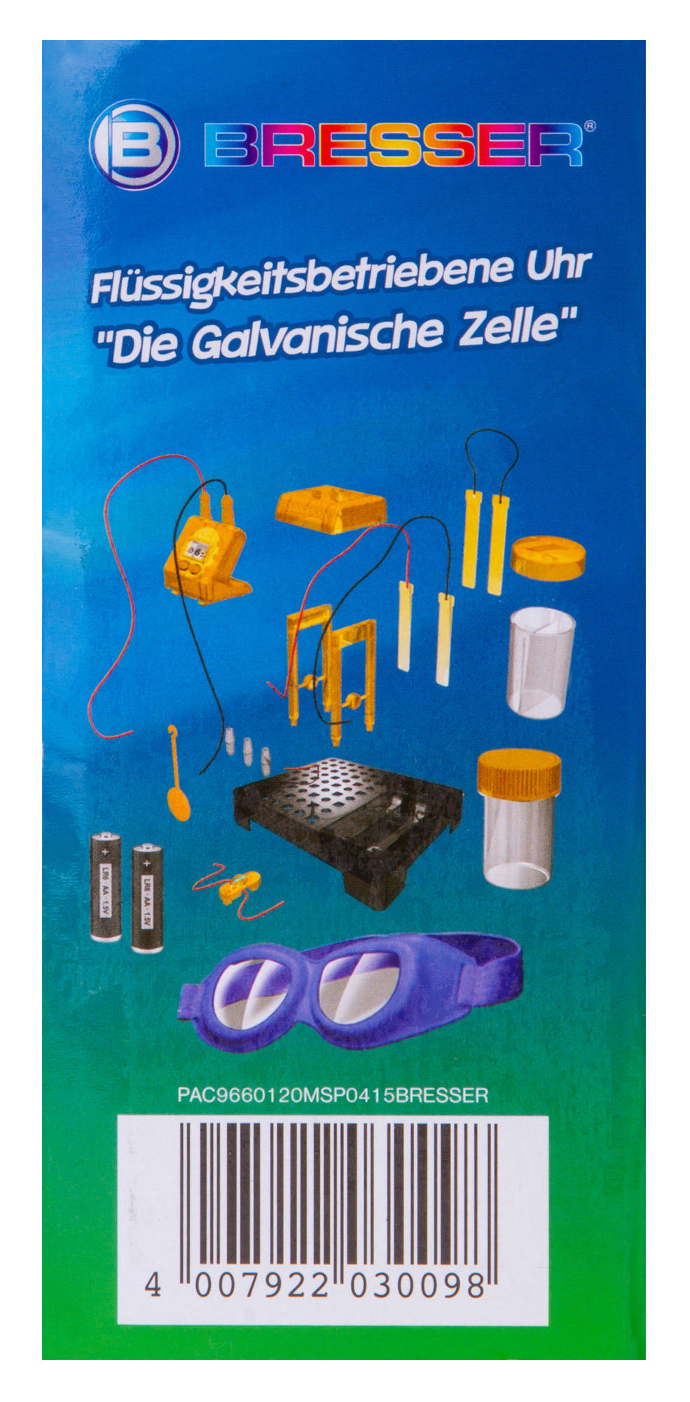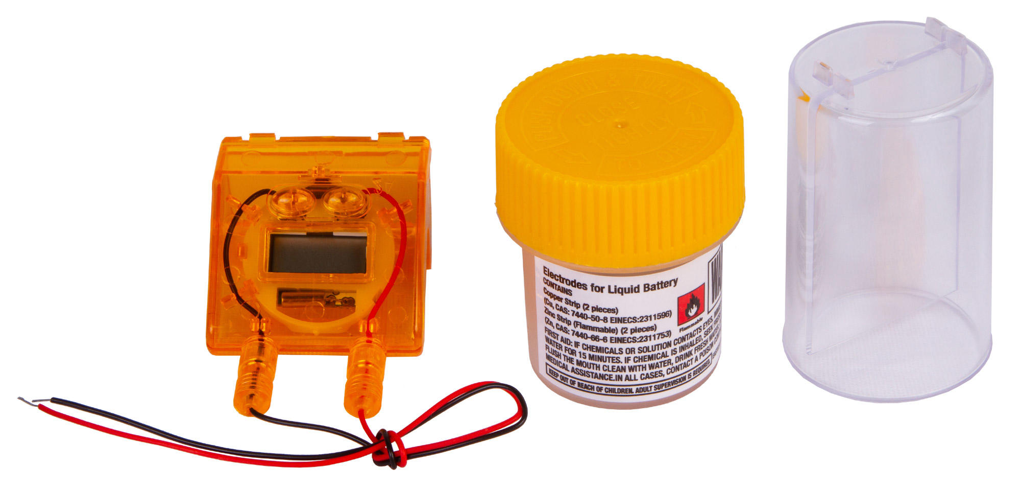 Набор Bresser Junior «Часы на жидкостном аккумуляторе» познакомит юного исследователя с основами химии и физики и даст возможность увидеть, как химическая реакция между двумя металлами может привести к возникновению в цепи электричества. С помощью этого набора можно собрать работающий аккумулятор и подключить его к цифровым часам, которые станут показывать время и текущую дату. Сама сборка несложная, все шаги подробно описаны в прилагаемом руководстве.