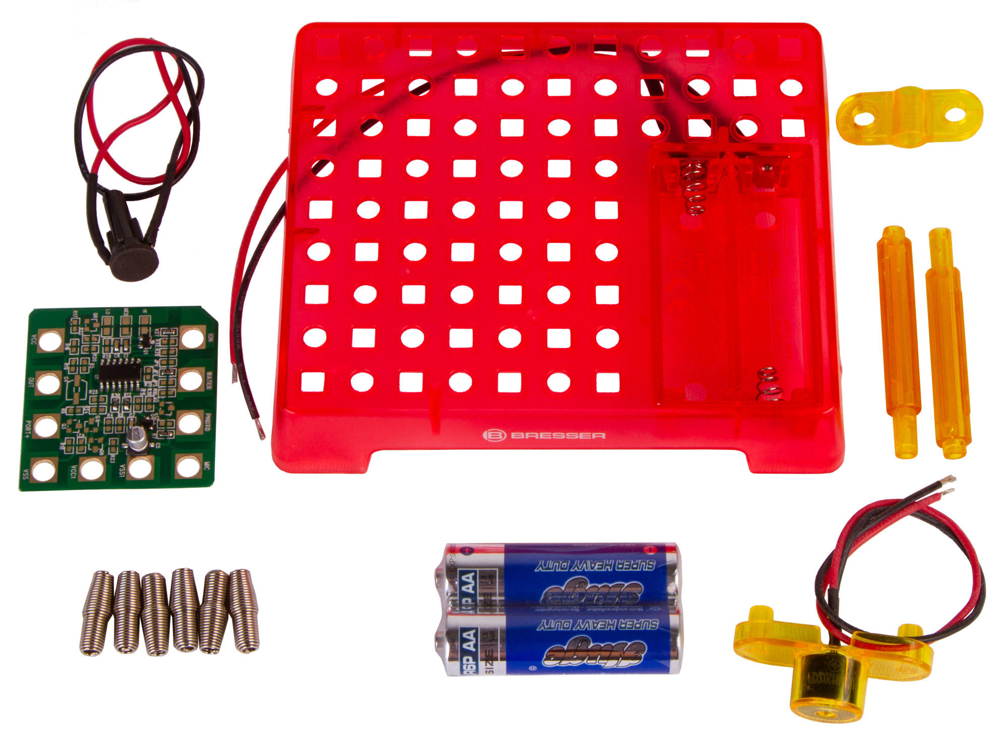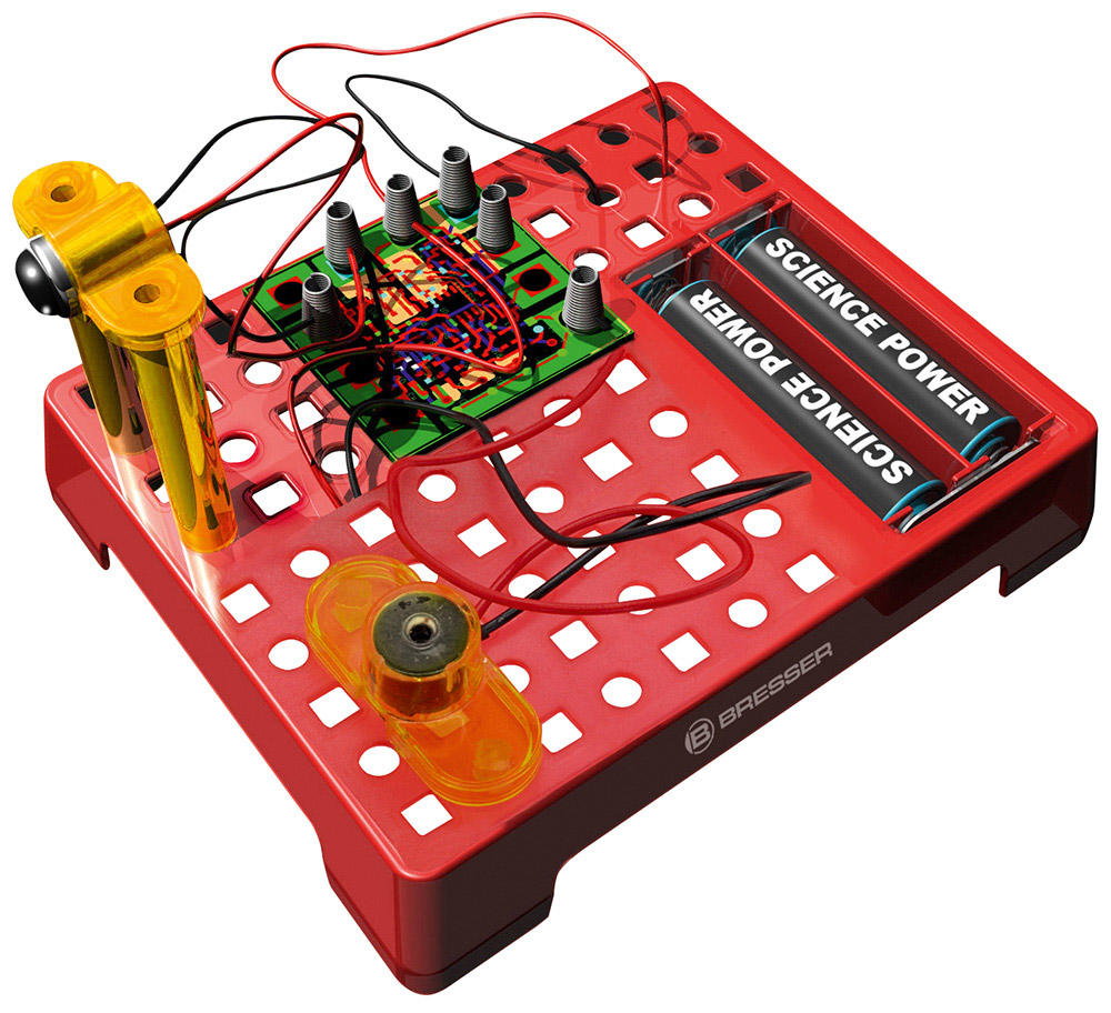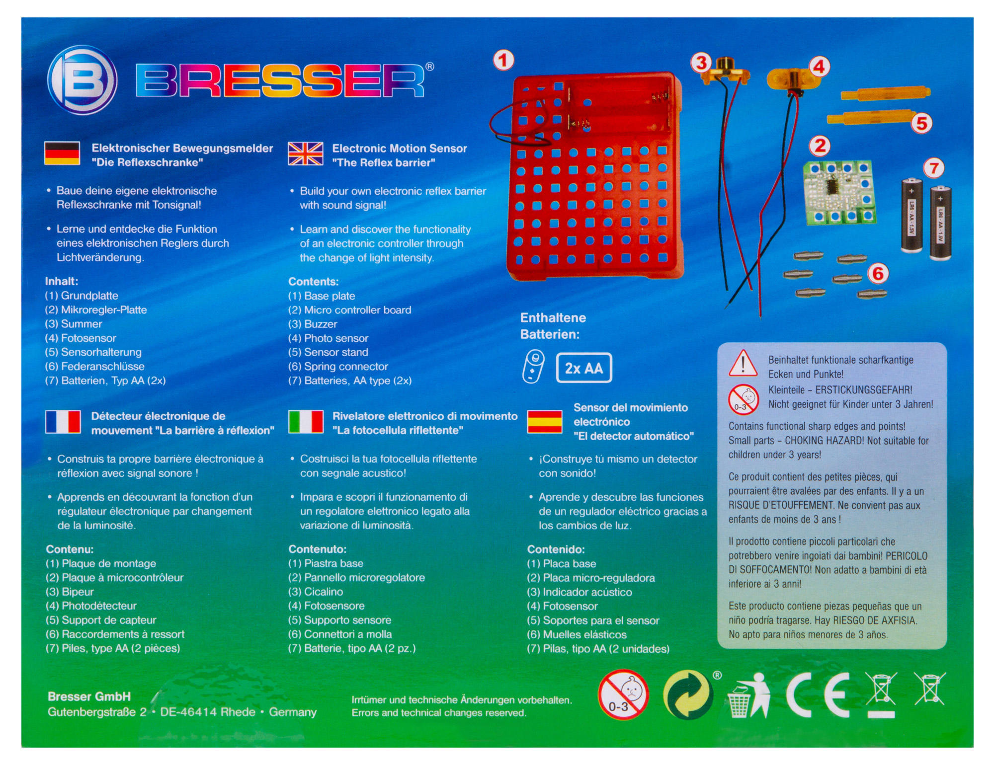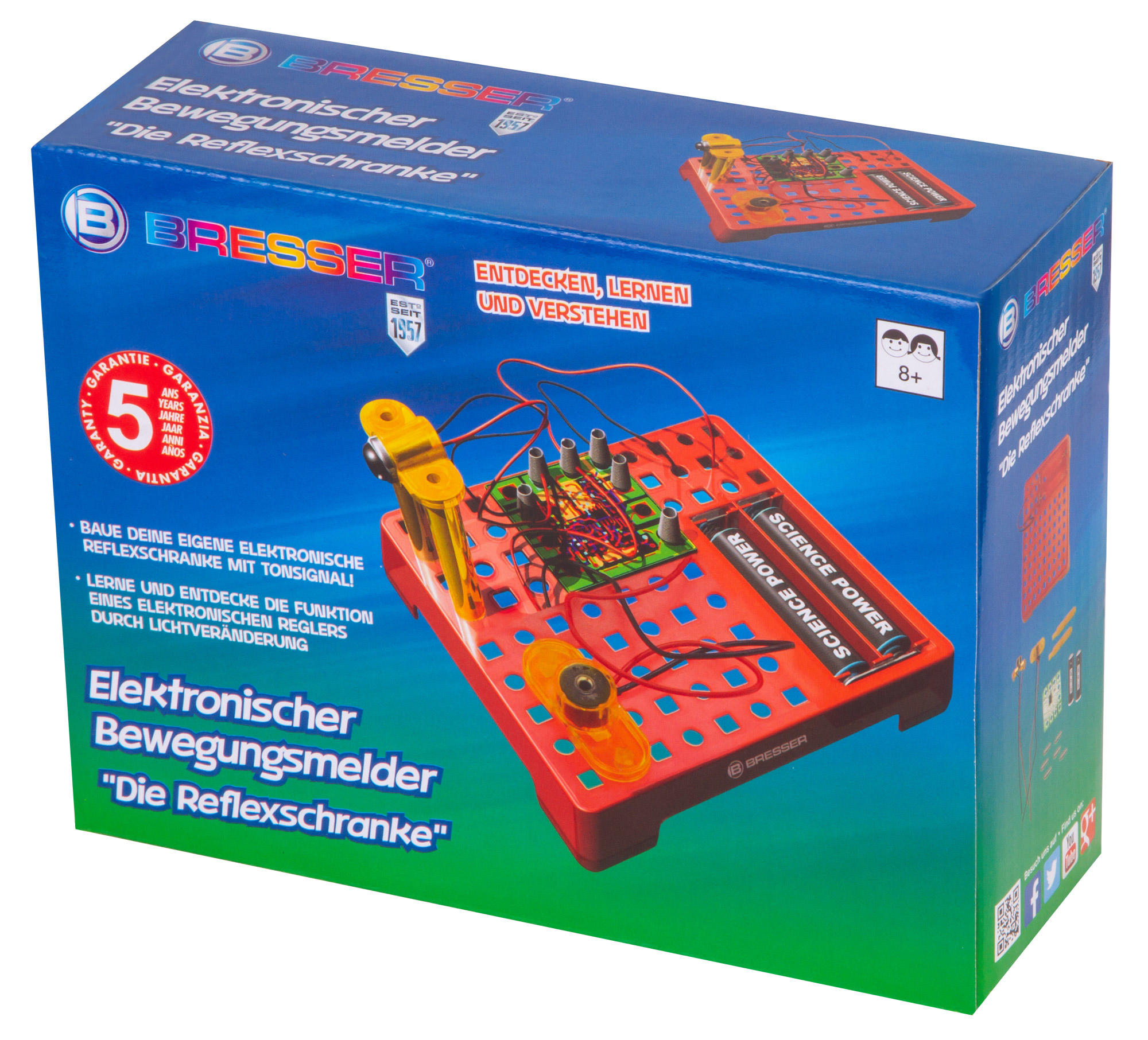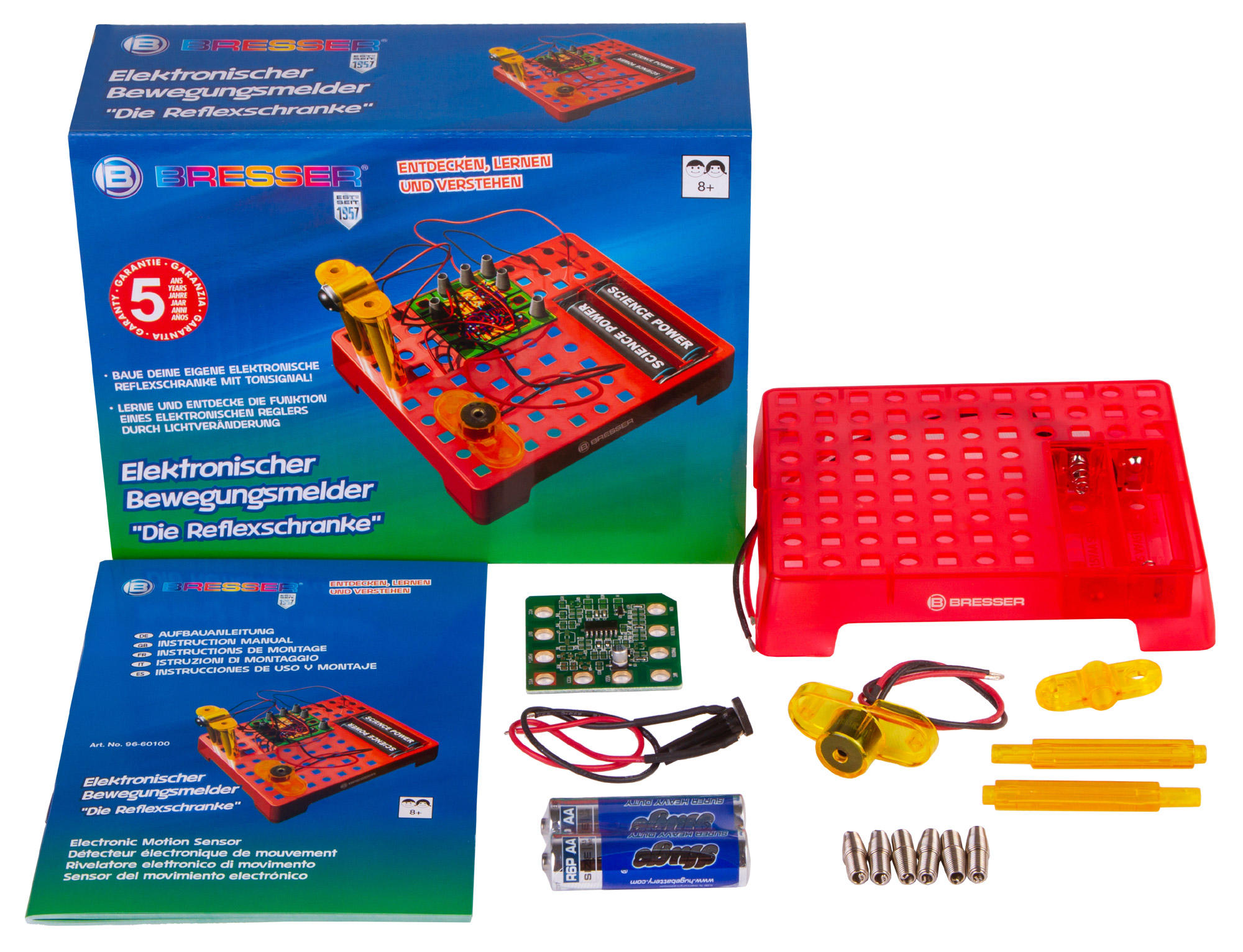 Набор Bresser Junior «Датчик движения» позволяет собрать настоящий датчик движения, похожий на те, что устанавливают в автоматические двери в торговых центрах. Он состоит из элементов, которые ребенок должен собрать в работающую микросхему по прилагаемому руководству. В итоге получится прибор, который будет издавать звуковой сигнал, если поднести к нему руку или пройти мимо.