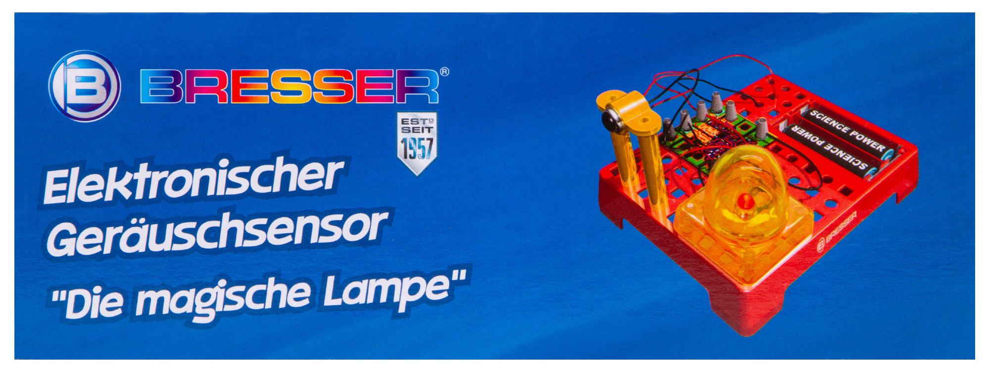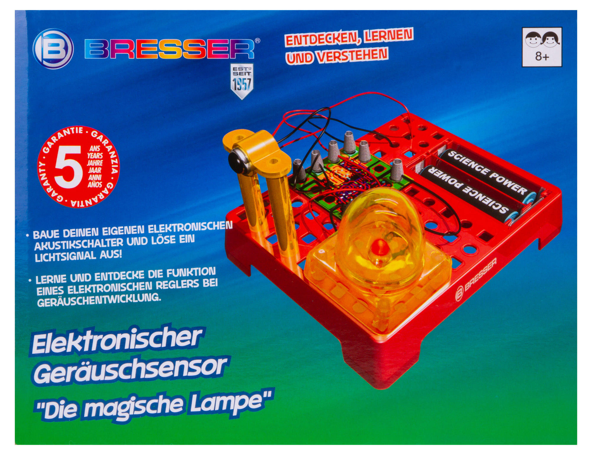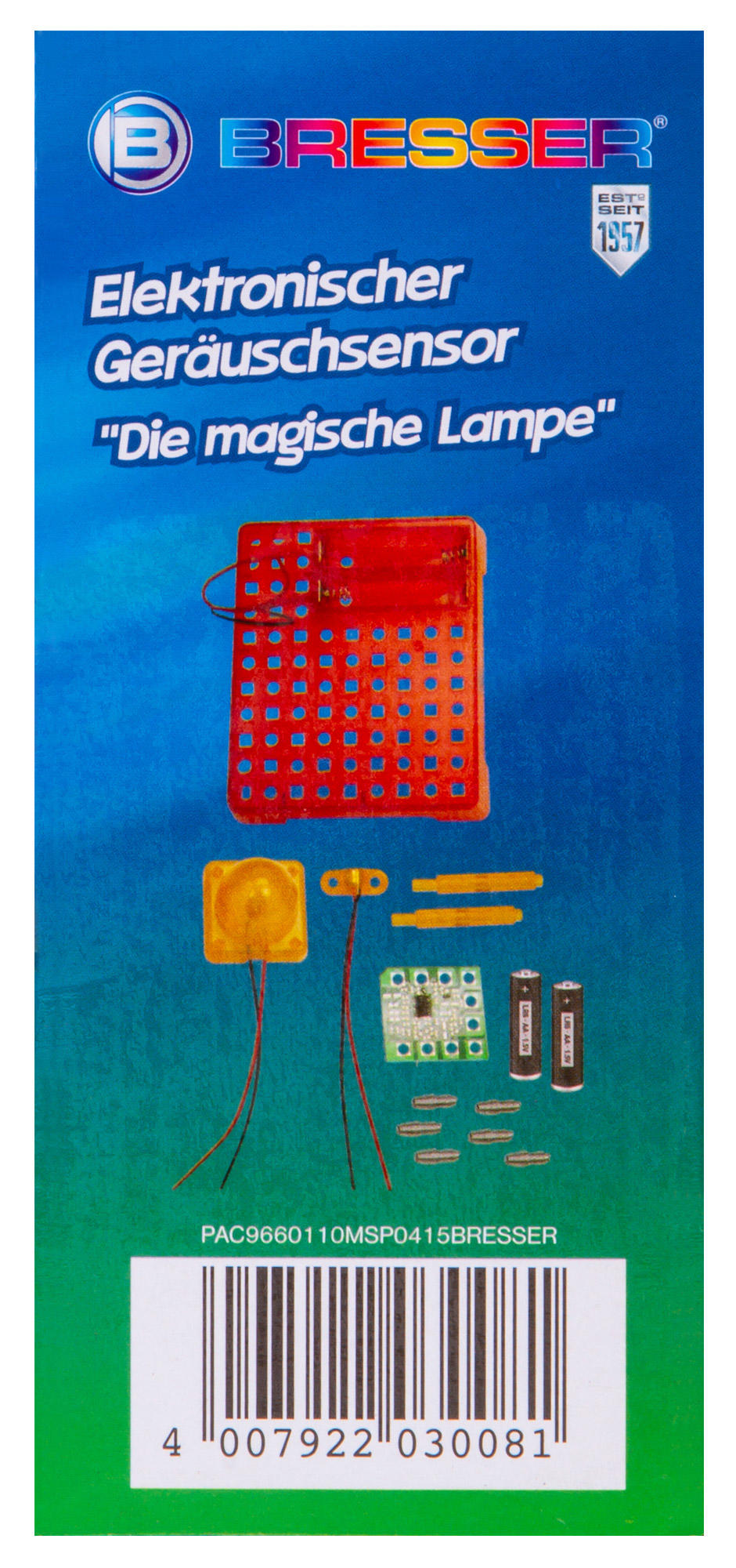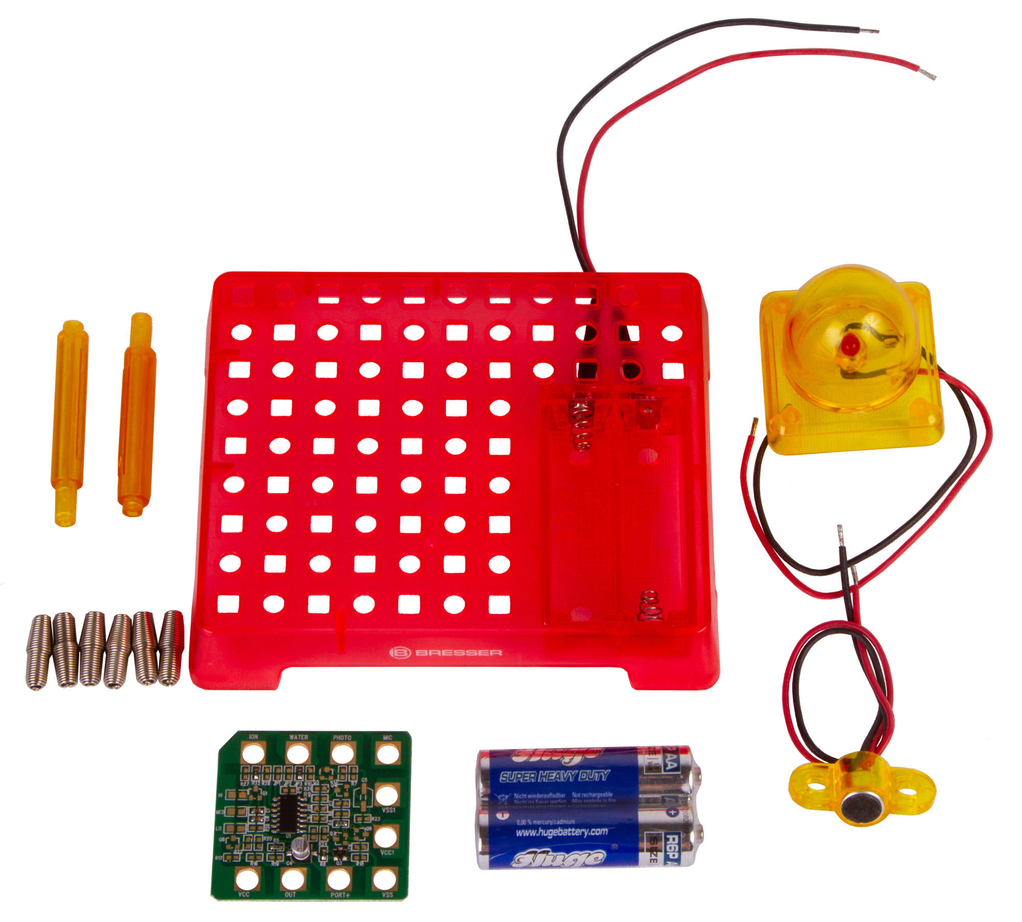 Bresser Junior «Датчик звука» – набор для экспериментов, с помощью которого можно собрать работающий датчик звука и познакомиться с принципом работы настоящей микросхемы. Порядок сборки и работа устройства подробно описаны в прилагаемом руководстве, поэтому ребенок вполне сможет использовать набор без помощи взрослых. В результате сборки получится прибор, который будет реагировать на звуки в помещении. При превышении заданного уровня громкости на микросхеме будет загораться светодиод.