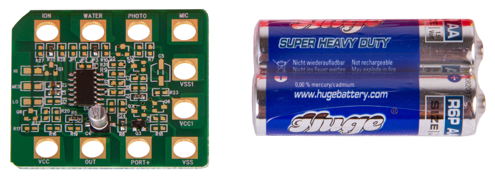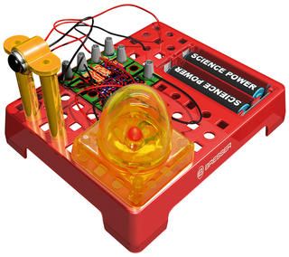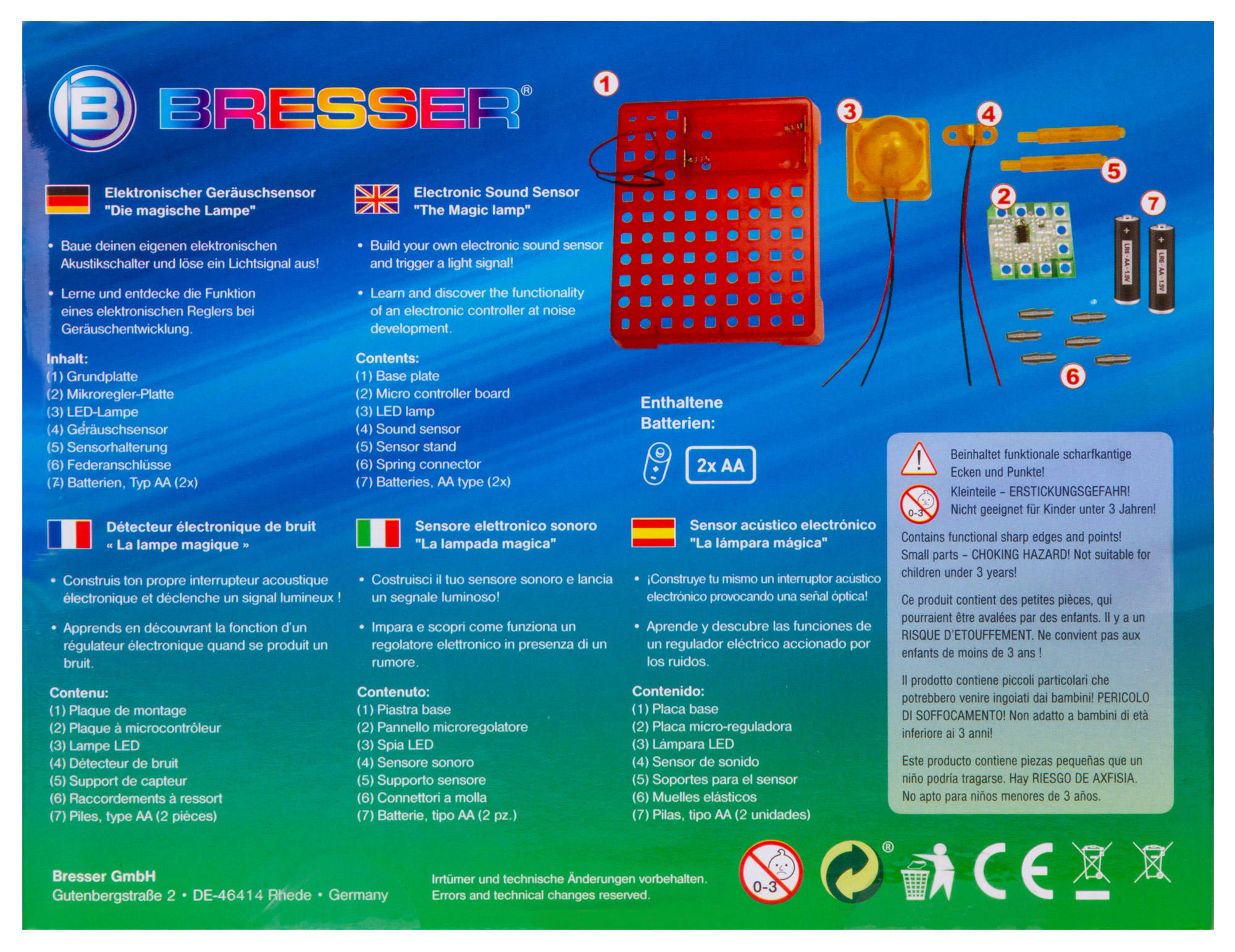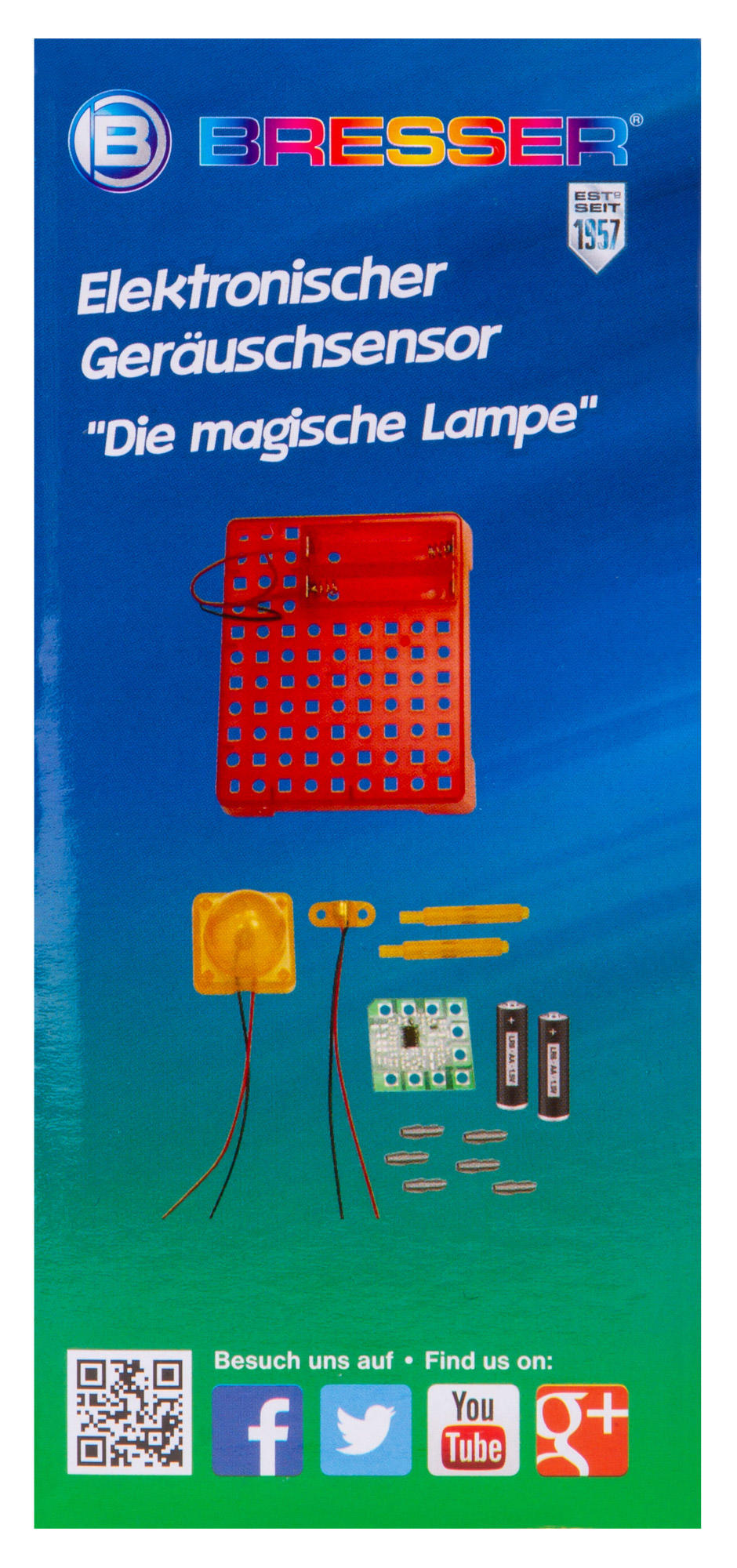 Bresser Junior «Датчик звука» – набор для экспериментов, с помощью которого можно собрать работающий датчик звука и познакомиться с принципом работы настоящей микросхемы. Порядок сборки и работа устройства подробно описаны в прилагаемом руководстве, поэтому ребенок вполне сможет использовать набор без помощи взрослых. В результате сборки получится прибор, который будет реагировать на звуки в помещении. При превышении заданного уровня громкости на микросхеме будет загораться светодиод.